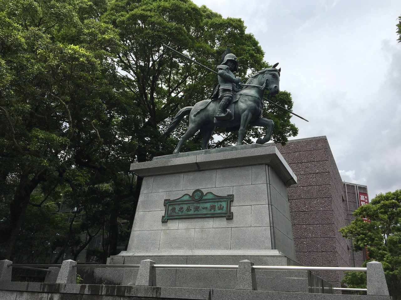 高知城の入り口、追手門の前に設置された銅像です。山内一豊は、関ケ原の戦いで功績を認められ、土佐を与えられてこの地に高知城を築城して城下町を整備したそうです。馬に乗って鎧を身に着けた姿が威風堂々としています。これから見学する高知城のワクワク感を盛り上げてくれました。