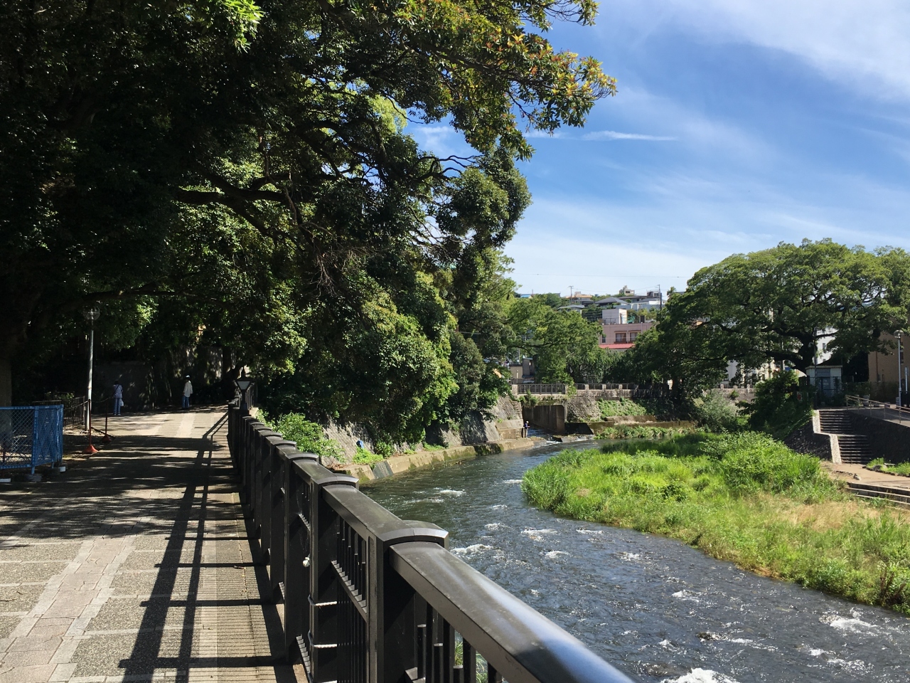 伊東の市街を流れる松川沿いには見所が多くあります。有名なのは大きな木造建築の元旅館の東海館や登録有形文化財になっている唐破風つくりの旅館いな葉ですが、さらに上流に進むと、温泉街を抜けて、緑豊かな音無神社があります。