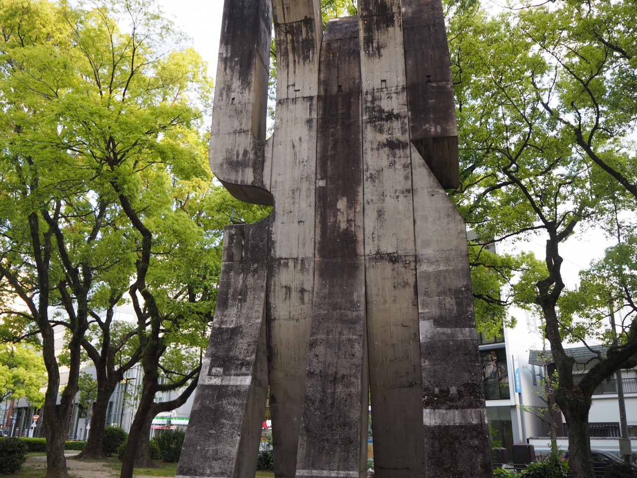 平和大通りの三井ガーデンホテルの斜め前の場所に「祈りの手」のモニュメントがあります。歩道横の街路樹の場所にあり、像は数メートルほどの高さの大きなコンクリート製のもので、手を合わせるようなことを意味しているようです。被爆での多く亡くなった医療関係者の冥福を祈るものです。