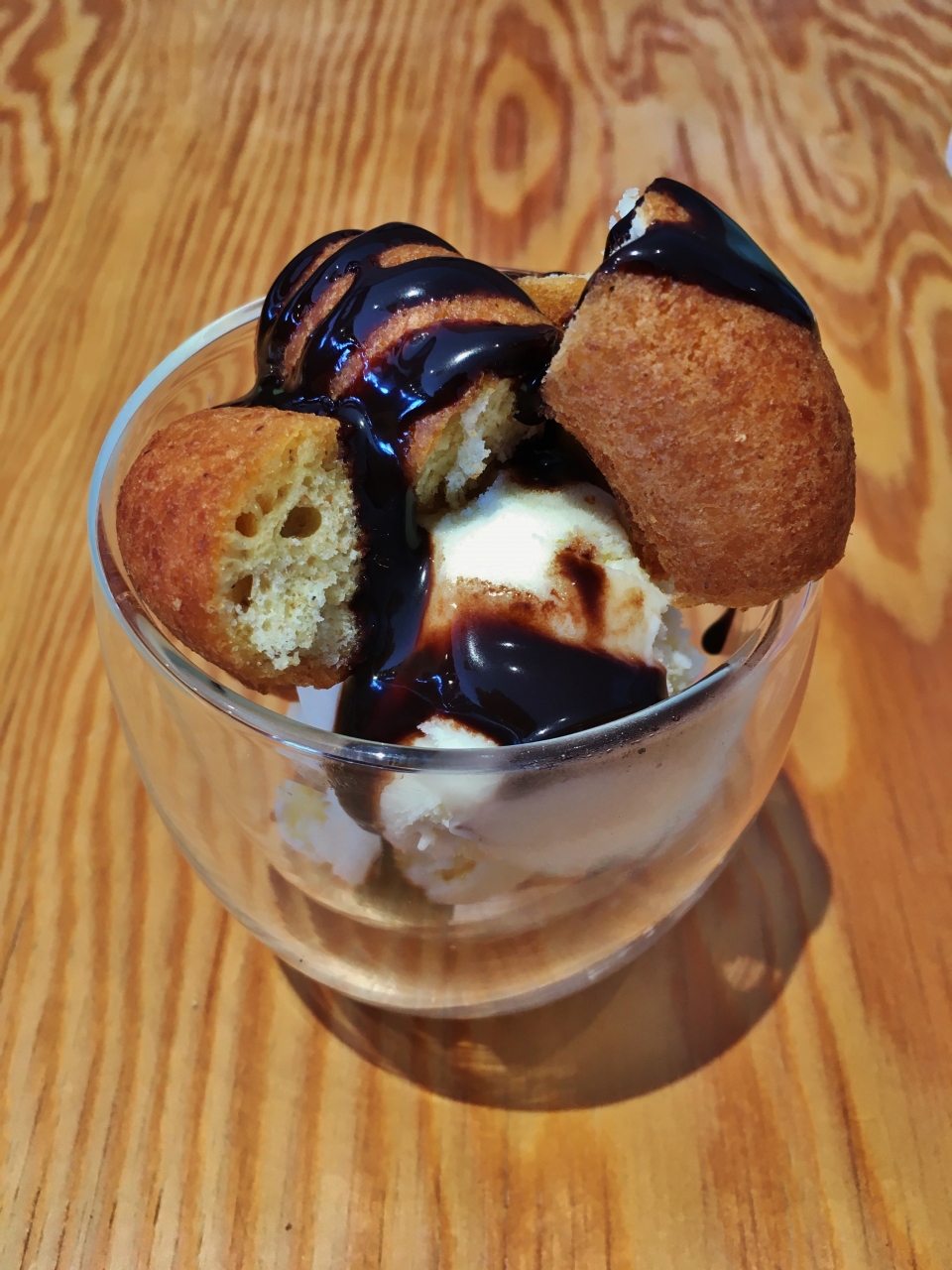 須磨を散策中にお店の前を通りかかり、休憩に利用しました。スイーツはドーナツのみですが、テイクアウトするお客さんがひっきりなしにやってきていました。先に商品を注文、会計を済ませて店内へ入ります。道路側が一面ガラス張りになり、天井も高くて開放的です。ドーナツにバニラアイスとチョコレートソースやアーモンドがトッピングされた“カモメサンデー”を注文しました。フロレスタのドーナツなので甘さ控えめ、優しいお味でした。店内のインテリアもナチュラルテイストで、居心地良くゆっくり休憩できました。