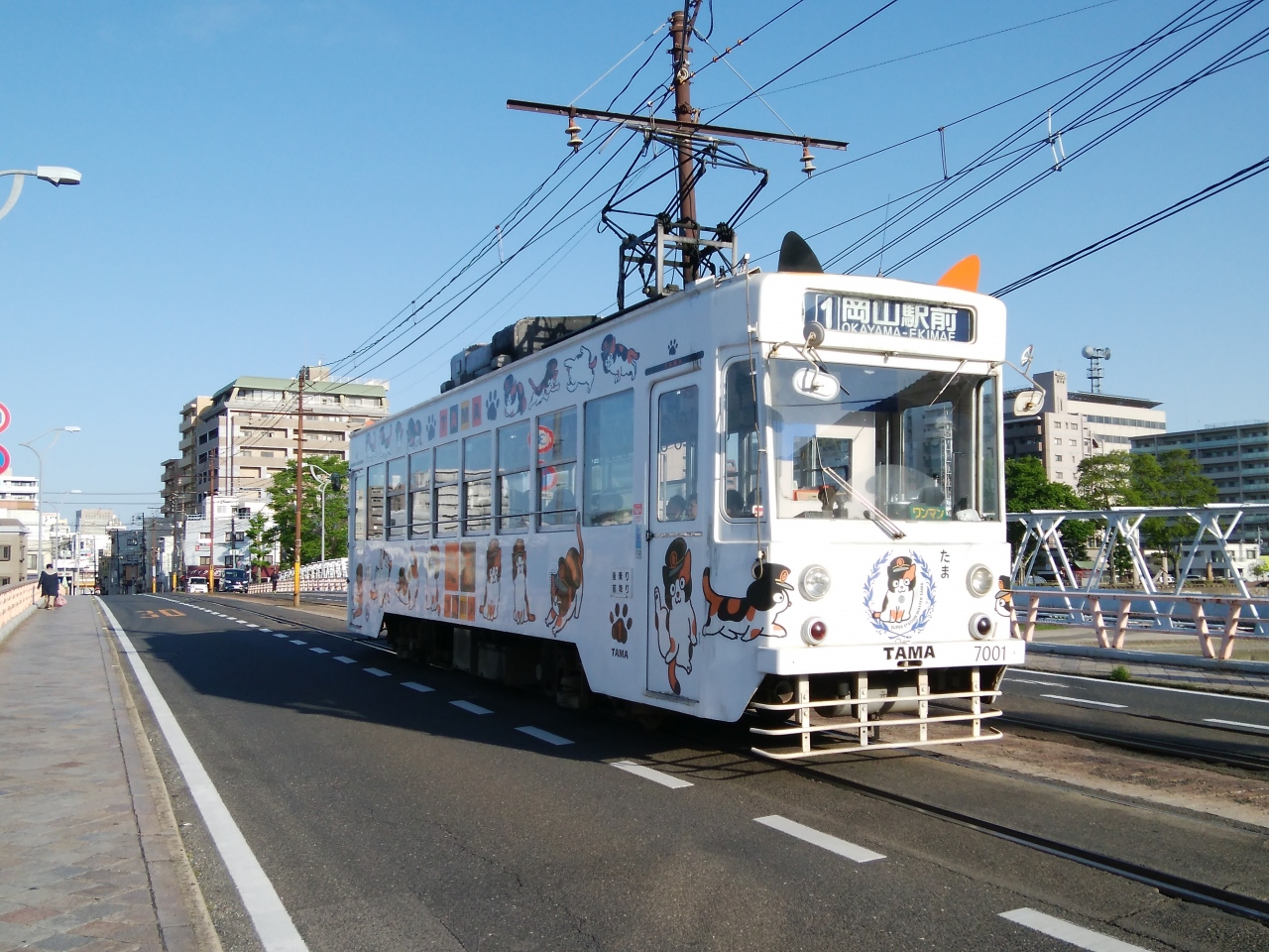 岡山市内中心部を走る路面電車だが、運行距離はそう長くない。観光客が使うとすれば岡山城や後楽園に行く時ぐらいだろう。それよりも地元出身の工業デザイナー・水戸岡鋭治がデザインを手がけた電車が走っているのが、観光的には注目される。MOMOやKUROなどの車両やイギリスのアニメ「チャンギントン」とタイアップした「おかでんチャンギントン」などがそれで、いかにも「水戸岡先生」的なデザインだ。また、子会社が運営する和歌山の電車の「たま車掌」をあしらった「たま電車」も人気だ。