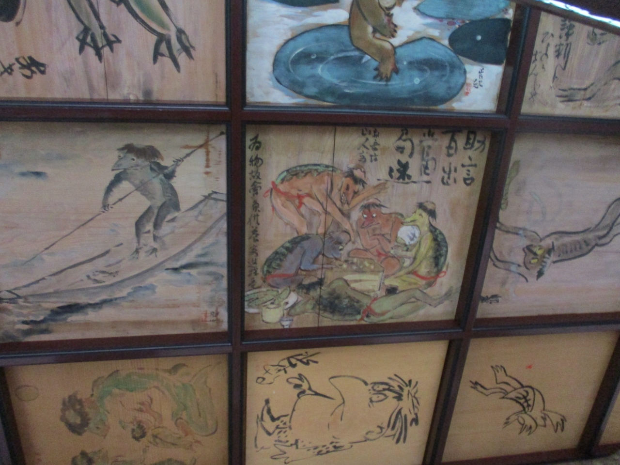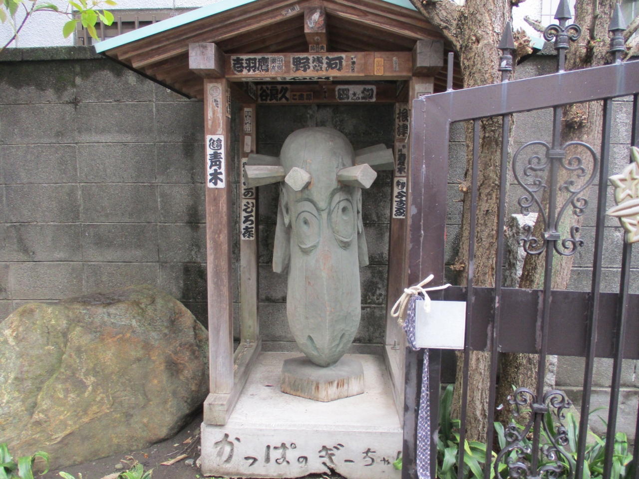 「かっぱのぎーちゃん」の人形があります。境内にはあちこちにかっぱのオブジェがあり、お供え物はきゅうりです。予約して、お堂の中を見学しました。かっぱの手のミイラや漫画家さんたちが描いたかっぱの絵の天井画など見れました。ユニークで親しみやすいお寺でした。