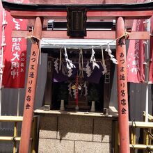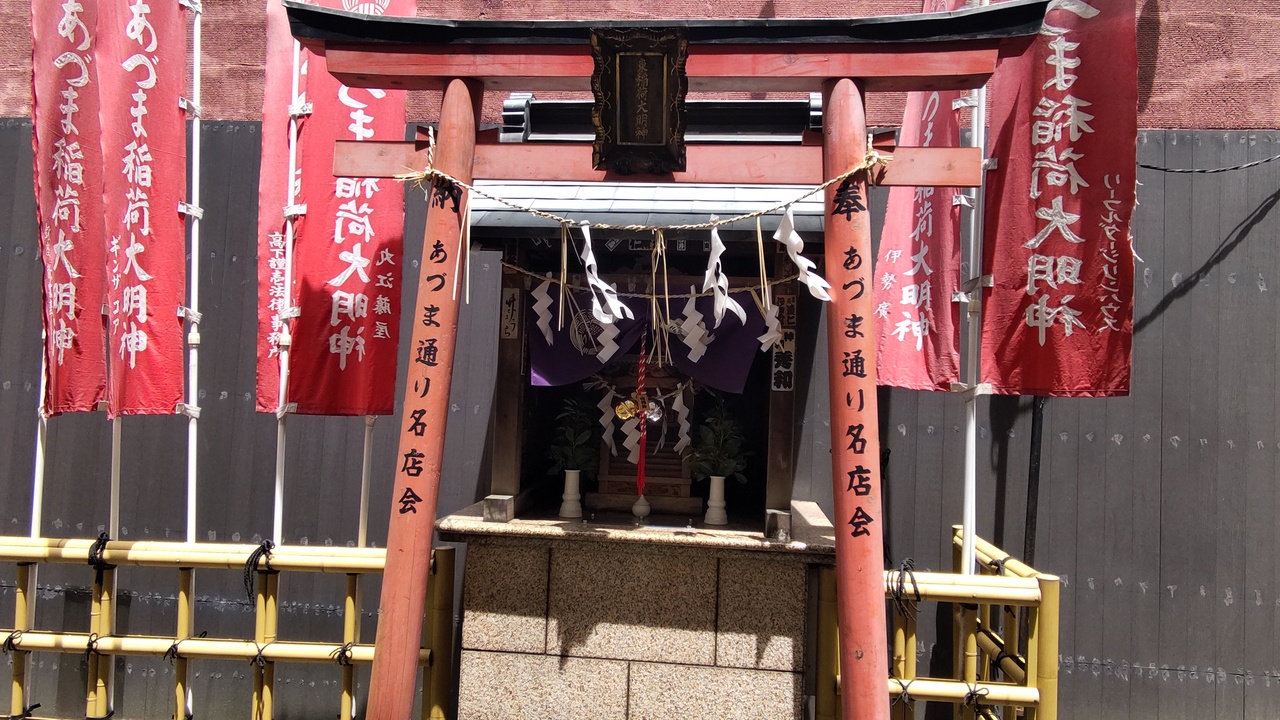 小路に入ってすぐ左側「あづま稲荷大明神」と書いた赤い幟の先に「あづま稲荷神社」があります。戦災で祀られていたお稲荷さんが消失し、戦後付近で相次いだ火災を鎮めようと置かれたようです。