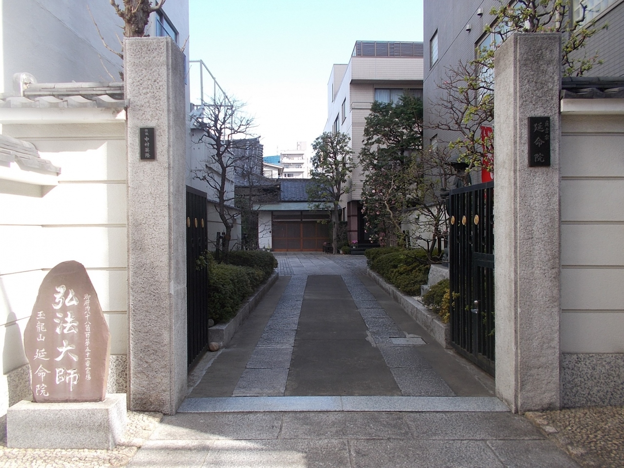 この延命院は浅草の元浅草にある寺の一つです。地下鉄東京メトロ銀座線稲荷町駅から南東のエリアにあります。この寺の創建は不詳ですが17世紀中ごろの明暦の大火の後に今の元浅草に移築しています。門柱の脇には弘法大師の石碑が置かれています。境内には弘法大師の立像がたてられています。本堂などは新しいものになっています。
