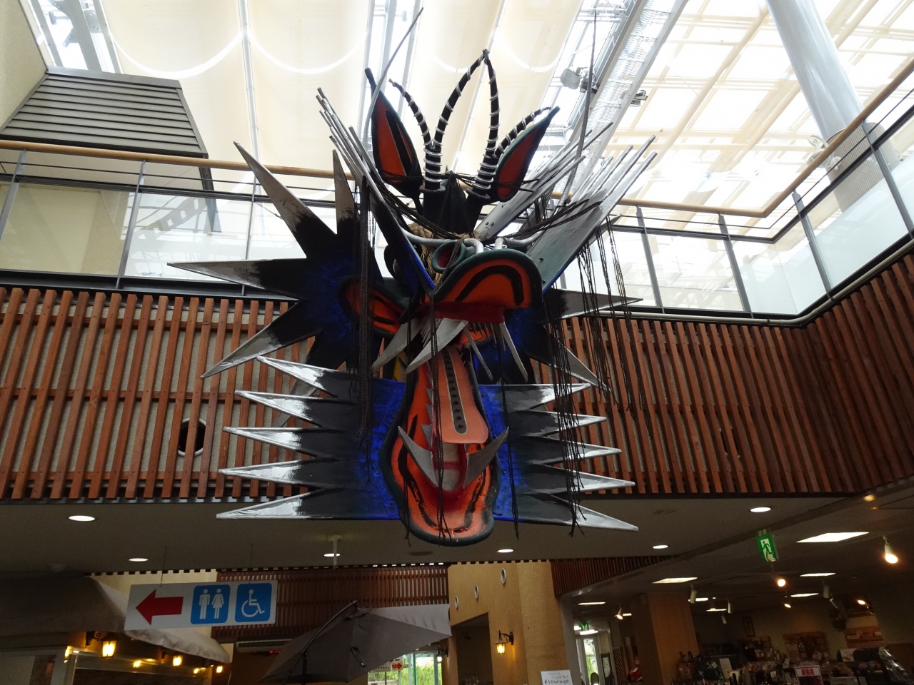 ガラス張りの建物内は吹き抜けがあって開放的。入口を通ると、大牟田の大蛇山まつりをモチーフにした大蛇の飾りが出迎えてくれます。