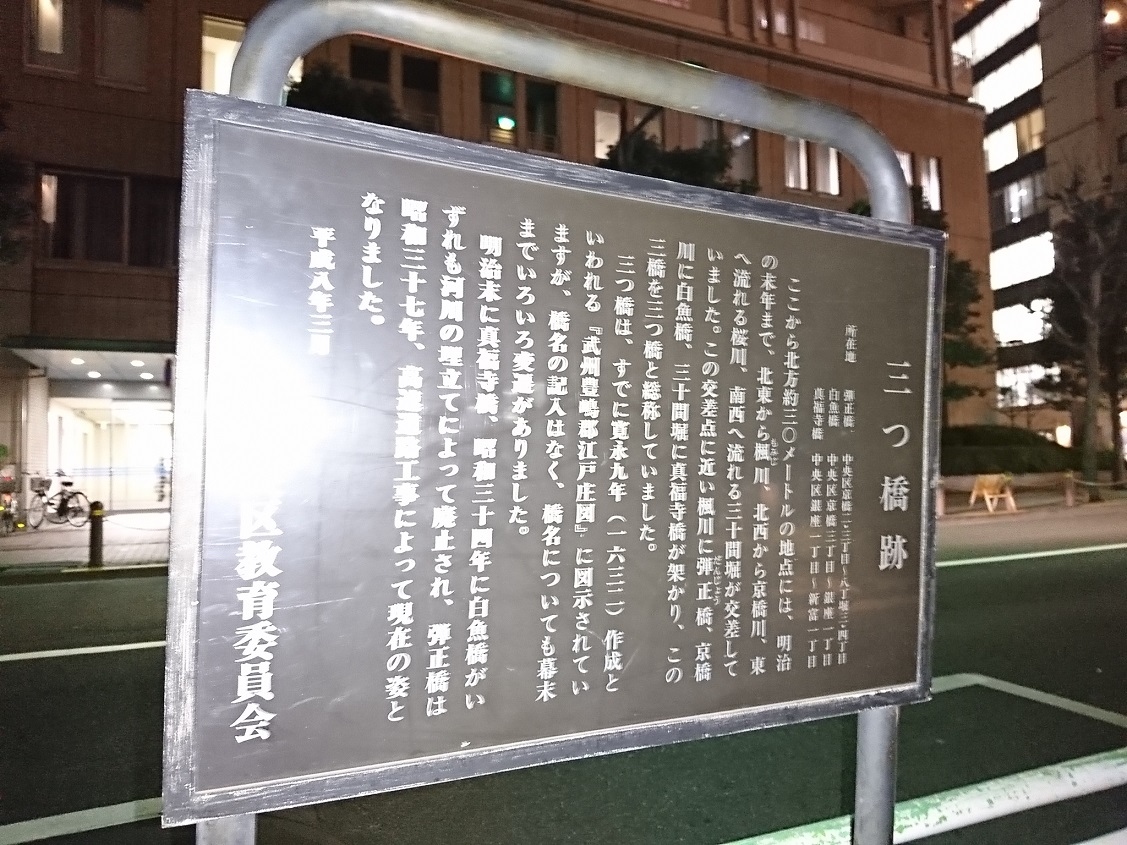 中央区銀座1丁目の歩道に三つ橋跡の説明板が立っています。かつてこの辺りには京橋川、三十間堀、桜川、楓川の4つの川や堀が流れていて、その交わる場所に通称三ツ橋と呼ばれていた弾正橋、白魚橋、真福寺橋の3つの橋が架かっていました。この場所に4つもの川や堀が有ったなんてびっくりです。