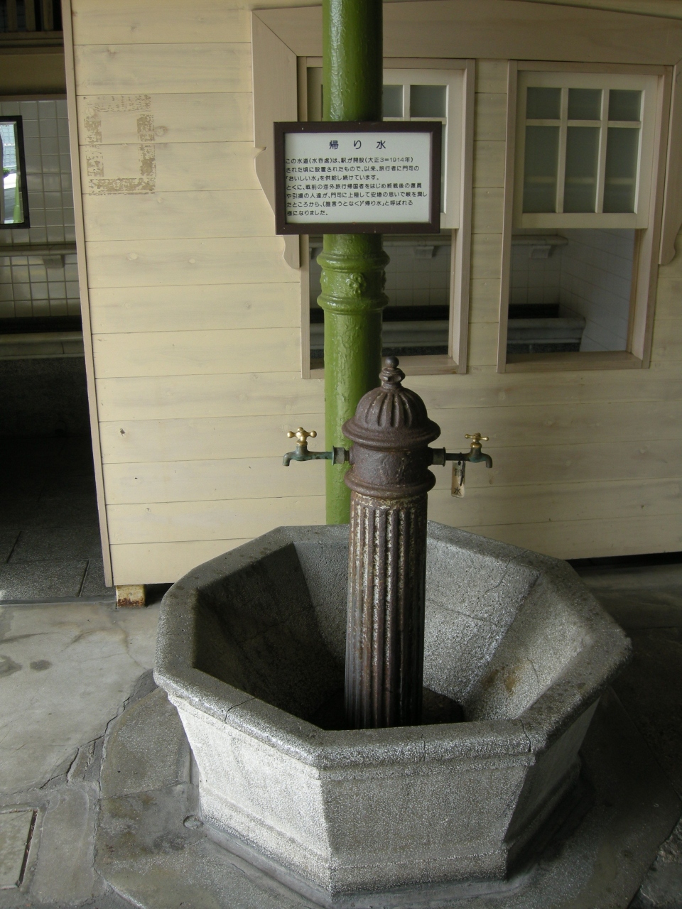 門司港レトロの玄関口である門司港駅の構内にある水飲み場です。駅が開設されたころに設置されたもので、戦後復員者たちなど、帰国した人々ののどを潤してきた歴史を持つ設備です。帰り水という名前もその歴史の中で自然に生まれたものということです。