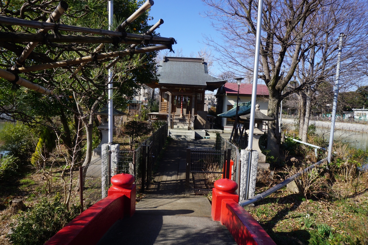 厳島神社は、碑文谷公園の弁天池のほとりに建つ神社。赤い太鼓橋を渡ると手水鉢に小さな社殿までが限られた場所に行儀よく並んでいます。