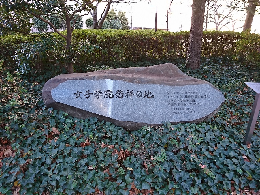 中央区明石町の聖路加看護大学敷地内に女子学院発祥地碑があります。明治時代の初期、日本の洋式教育が次々とこの地域に発祥しましたが、そのうちの一つ、女子学院が建っていた場所です。青山学院や明治学院も隣接して建っていたそうです。築地には女子学院のほかにも学校の発祥地碑がたくさんありますので、一通り巡ってみるのも楽しいと思います。