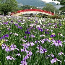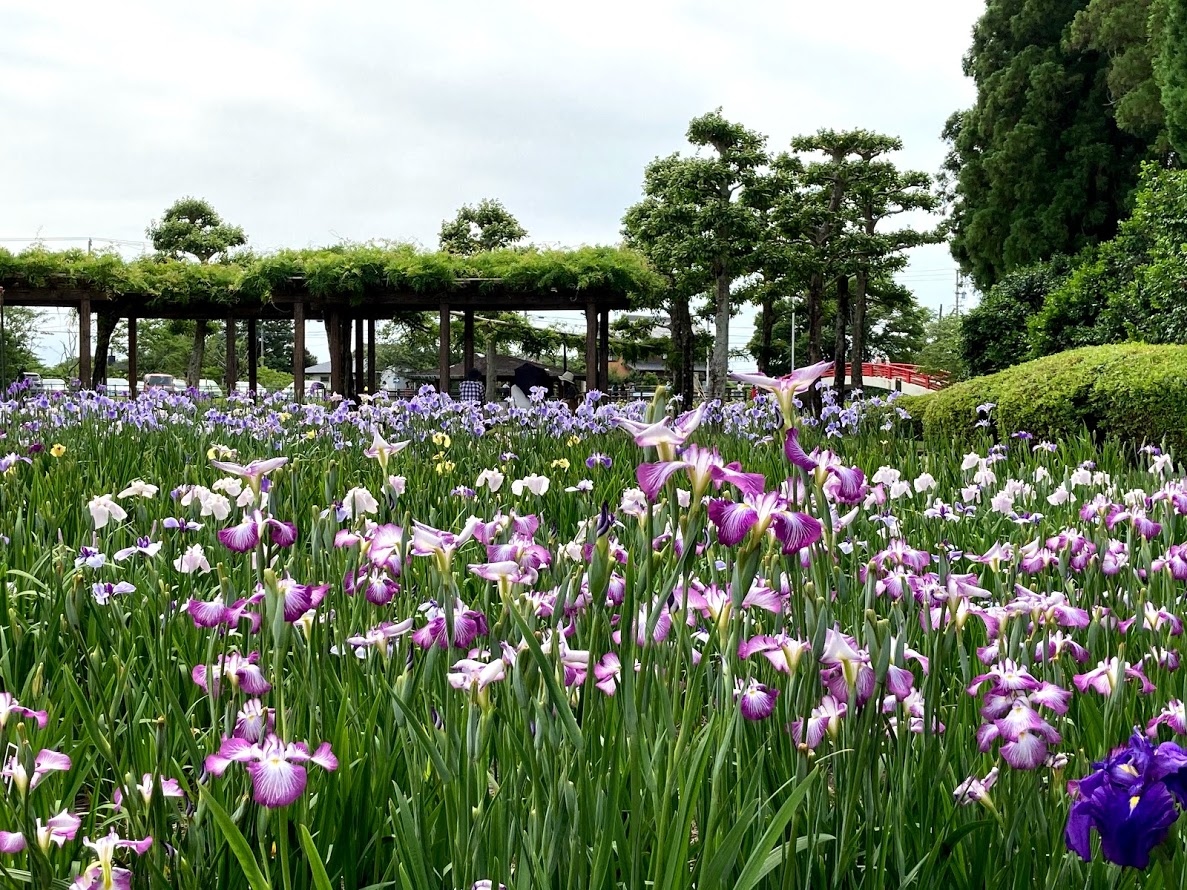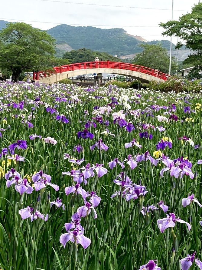 敷地も広く、手入れも行き届いて、ほぼ満開の色とりどりの花しょうぶを鑑賞させていただきました。赤い橋がとても映えて素敵でした。花しょうぶの名前のプレートもそれぞれに付けていただいています。入場料も、駐車場料も無料というのもありがたいですね。