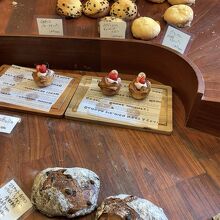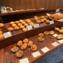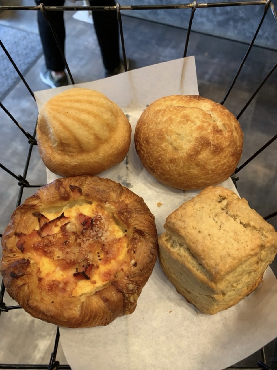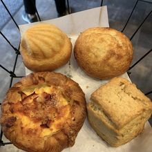 色々なパンがあるなか、4種類のパンをチョイス。 トングで掴むのも大変なくらいトロトロのクリームが入った、貝の形っぽいクリームパン、なかなか美味しかったです!