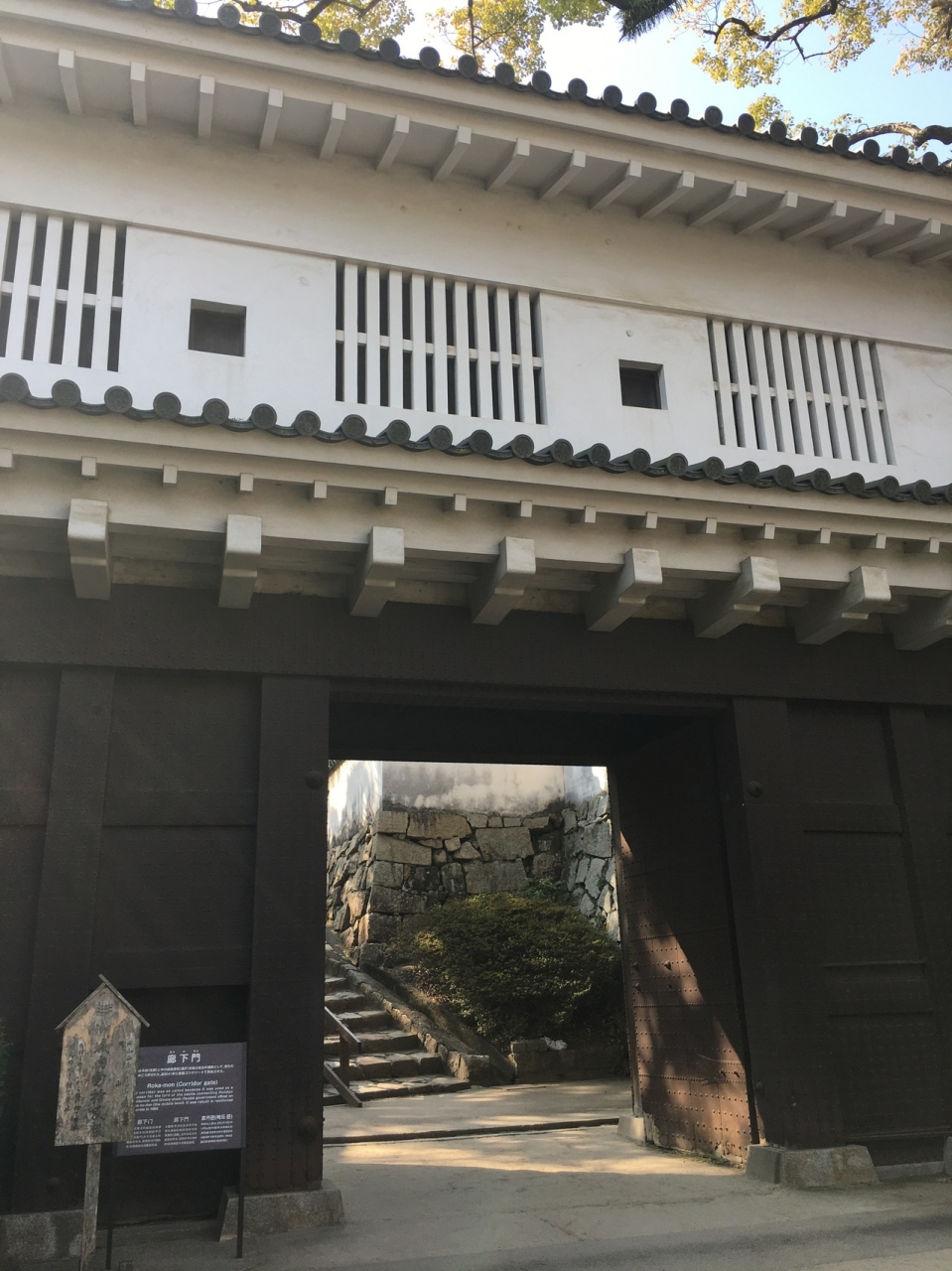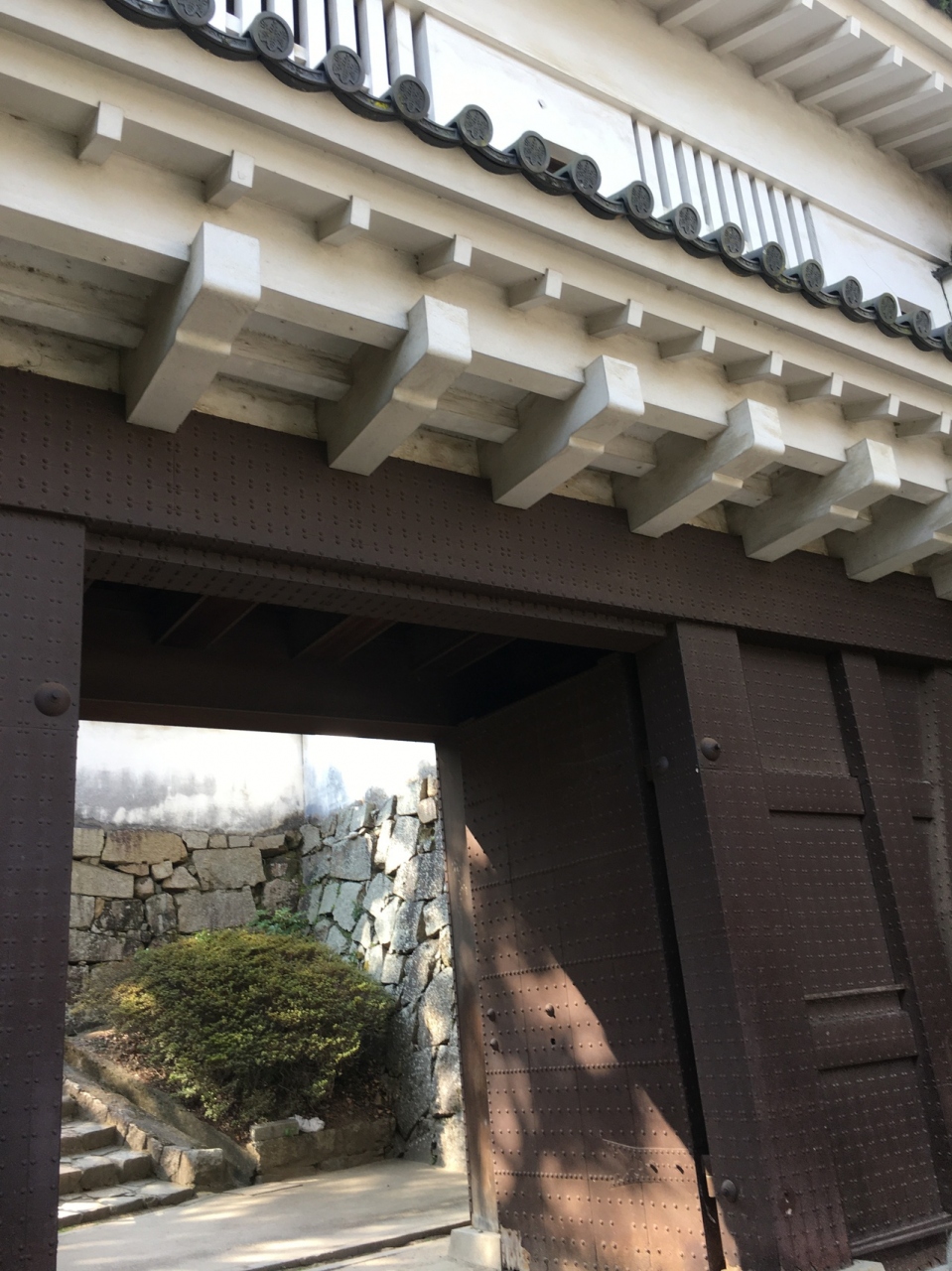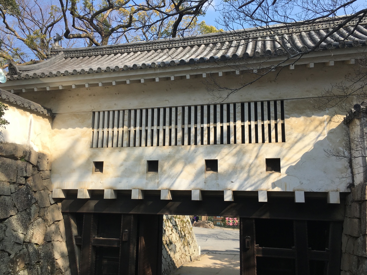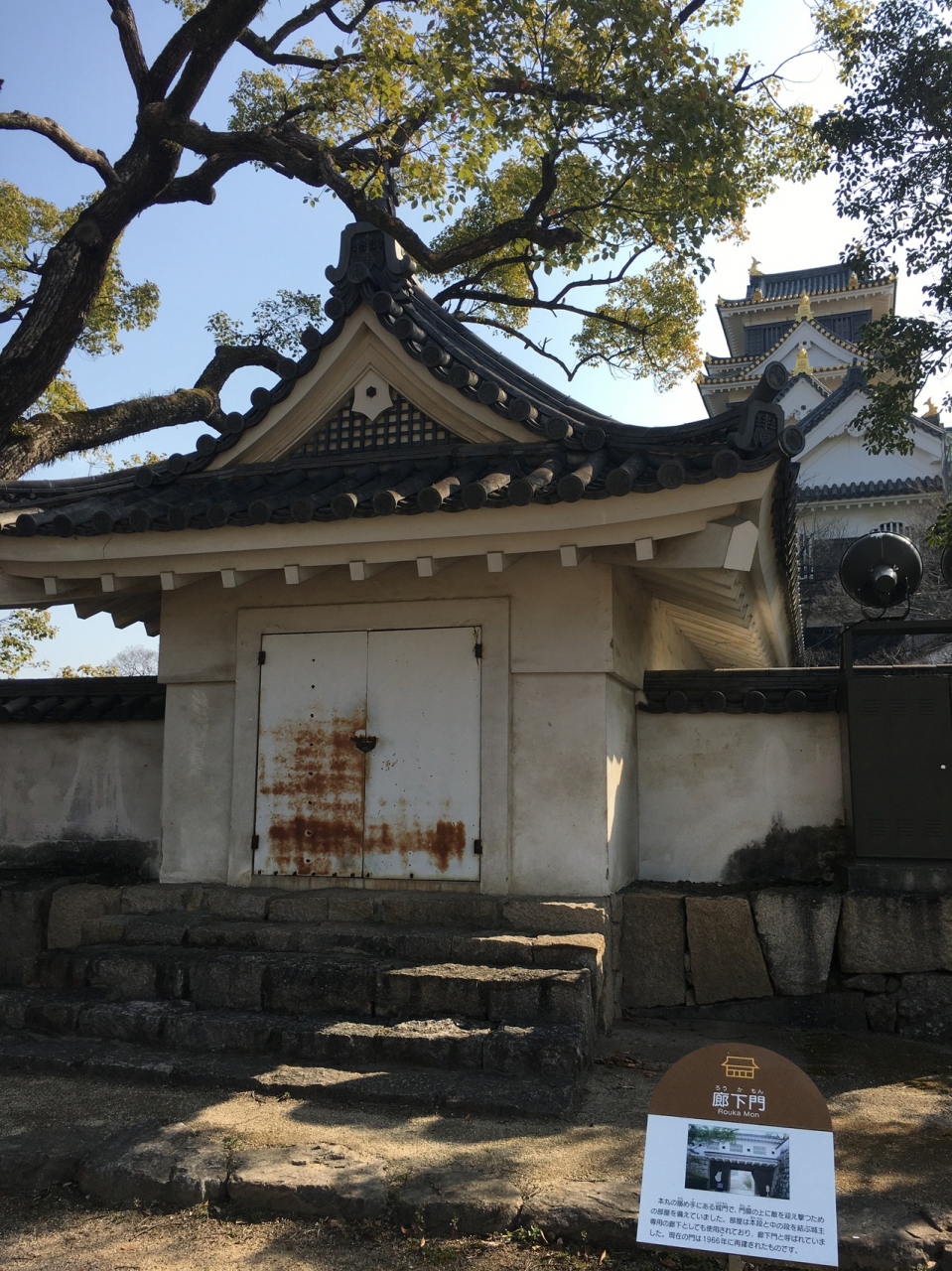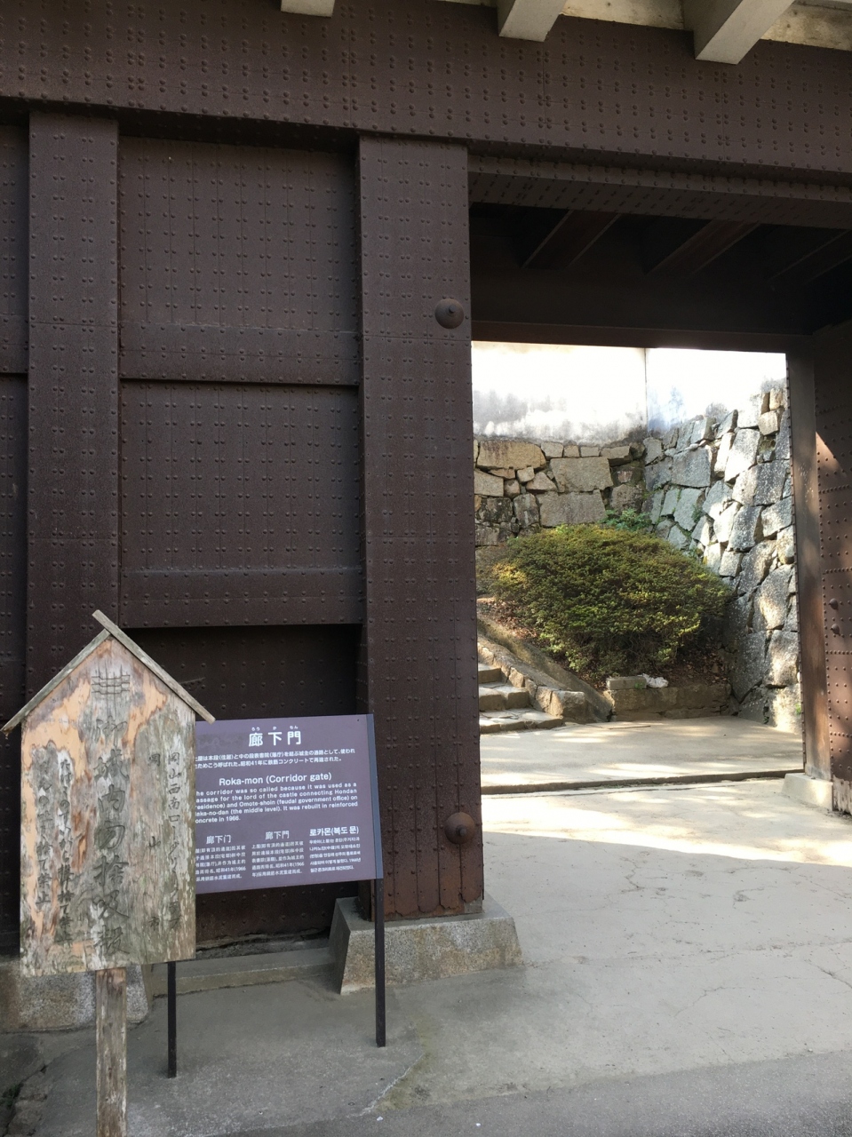 住居と中の書院を結んだ門で、この名称です。岡山後楽園から行くと最初の門で、2層の作りで上部には白色で昭和41年に鉄筋コンクリートで再建されたものです。鉄砲で撃っても跳ね返せそうな扉でした。門を潜ると階段です。