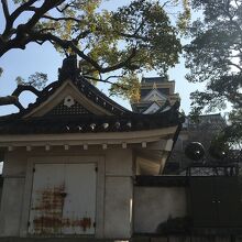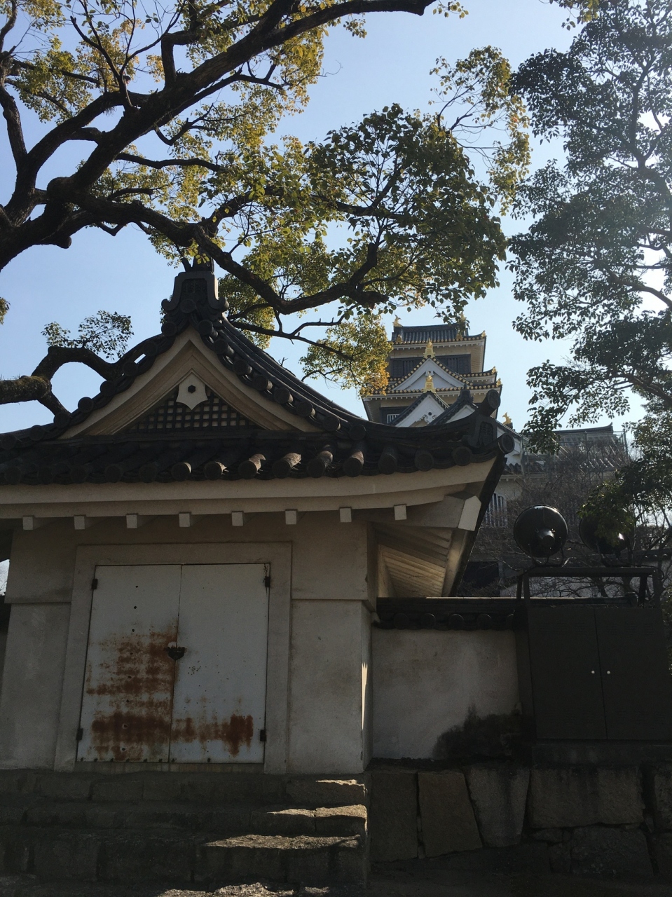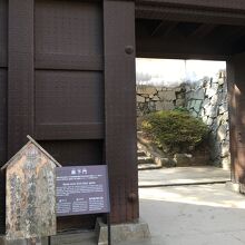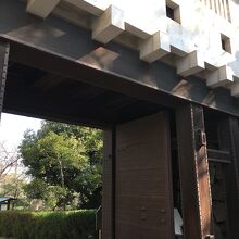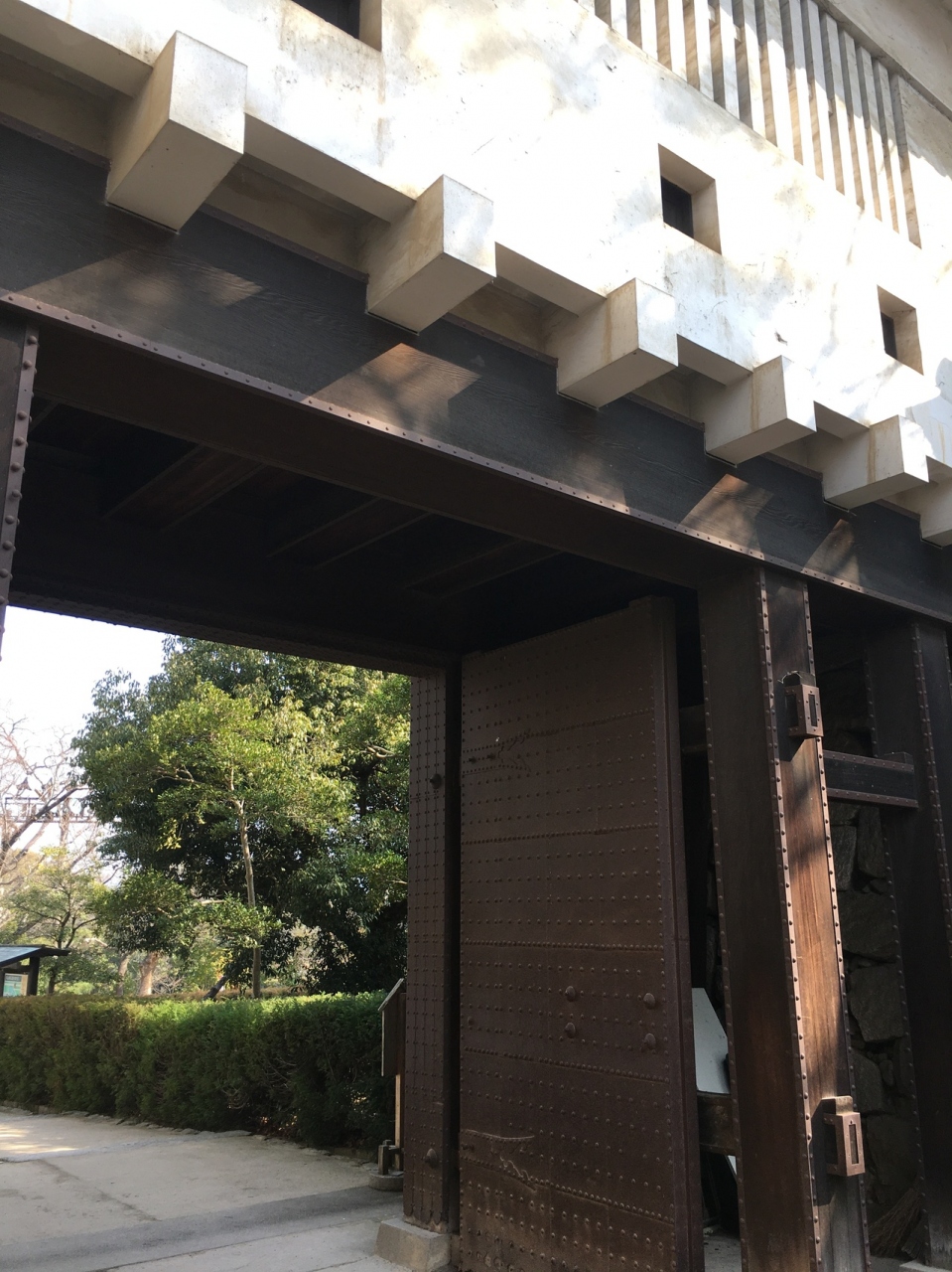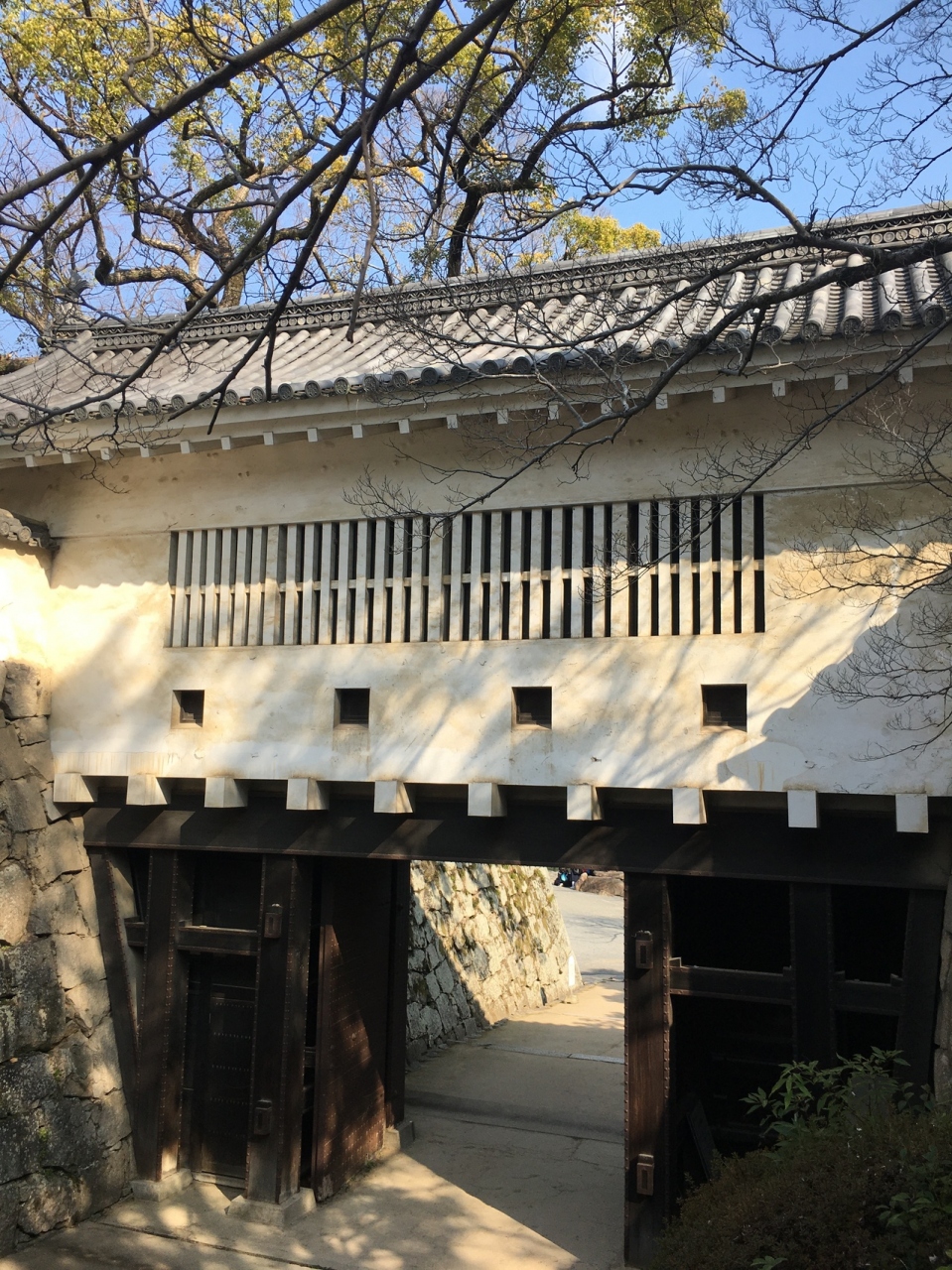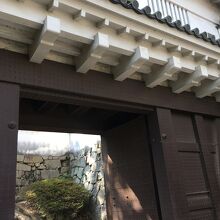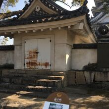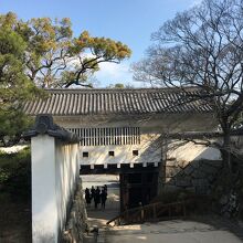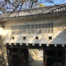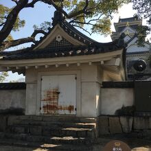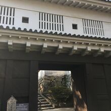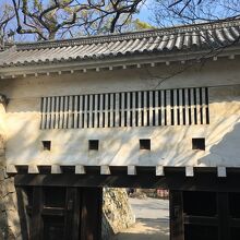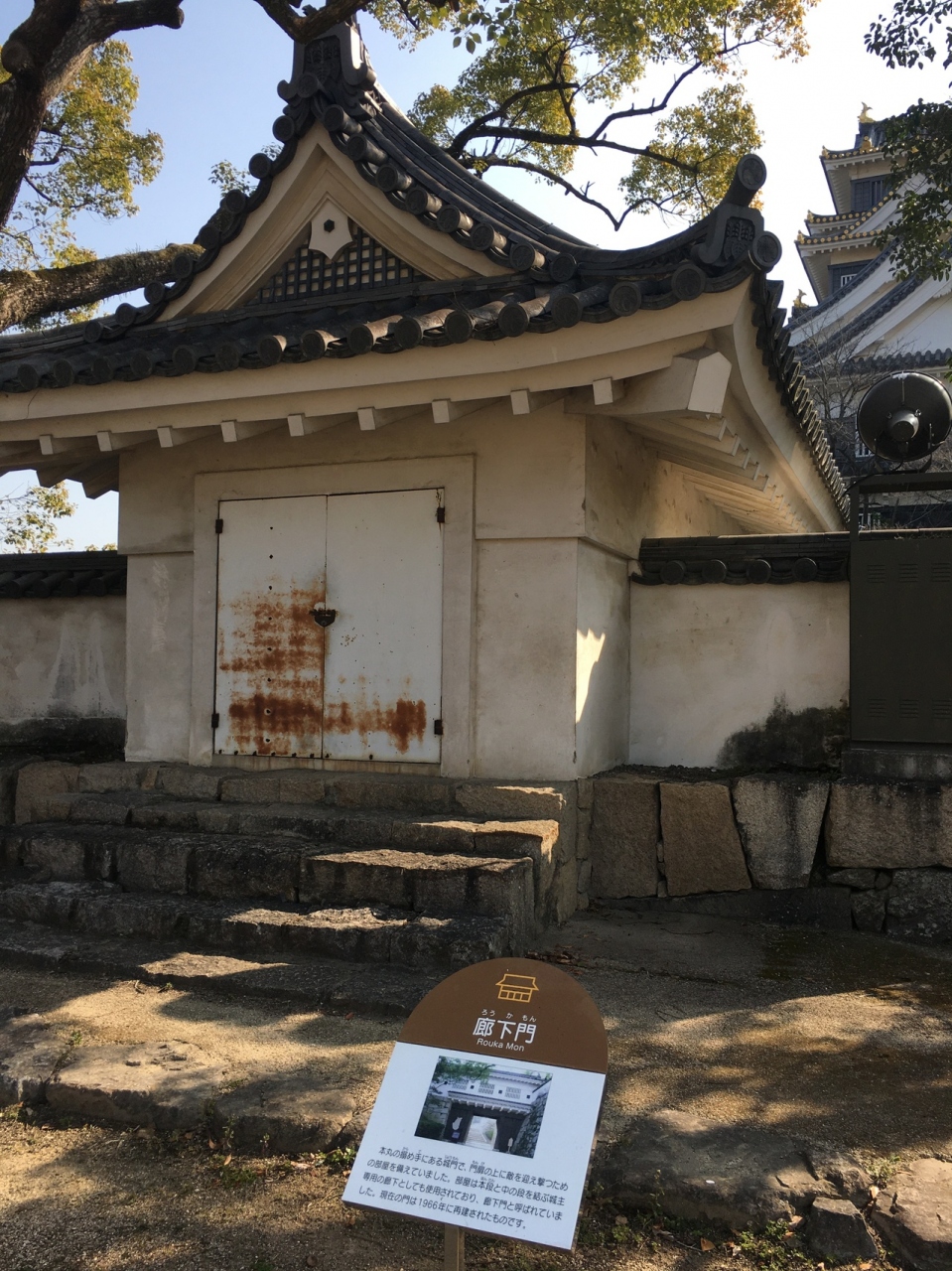 住居と中の書院を結んだ門で、この名称です。岡山後楽園から行くと最初の門で、2層の作りで上部には白色で昭和41年に鉄筋コンクリートで再建されたものです。鉄砲で撃っても跳ね返せそうな扉でした。門を潜ると階段です。