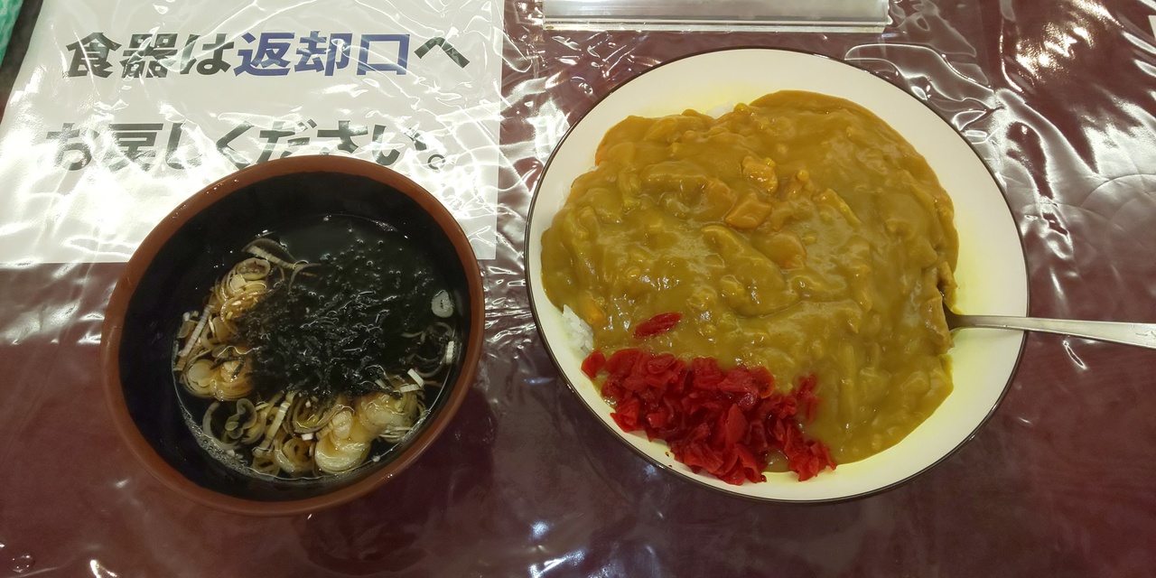 ホテル内仮店舗に到着し、カレーとスープをオーダー。