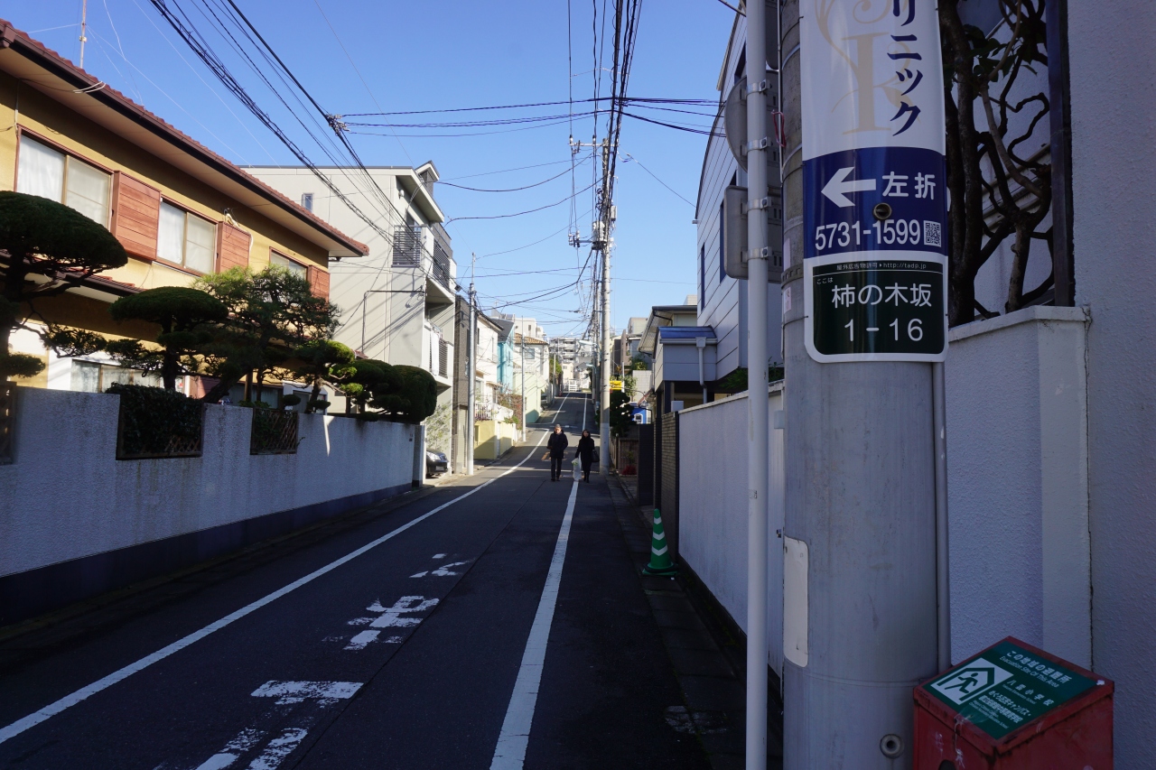 柿の木坂は、町名の柿の木坂と坂の方は目黒通りの一部の柿の木坂の二つがあるようですが、写真は町名の柿の木坂の方。けっこう広い範囲ですが、あちこちが坂になっていて、最初に地元の人に尋ねても「どれが柿の木坂といわれてもねえ」と返されるばかりでした。