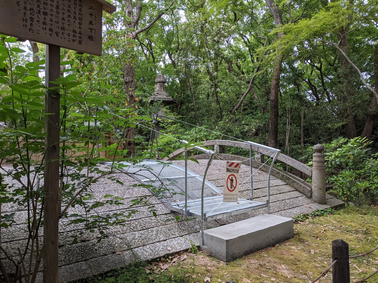 熱田神宮の境内にある石橋です。参道から少し入ったところにあるため、注意していないと素通りしてしまうような場所にありました。残念ながら工事中のため、橋を渡ることはできませんでしたが、名古屋最古の石橋であることを知り少し驚きました。