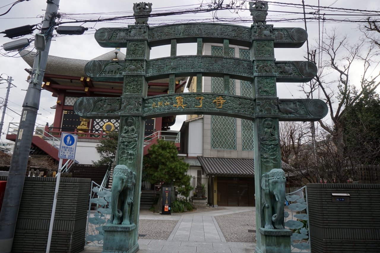 真了寺は、徳川家ゆかりの寺でもある日蓮宗 天妙国寺の塔頭として延宝元年(1673年)に創建された寺。ペット霊園があったり、水ごり修行でも知られるようですが、まず驚くのは青銅で作った山門の奇抜さ。修行をするブッダの姿や象のデザインはほかではちょっとお目にかかれないものだと思います。