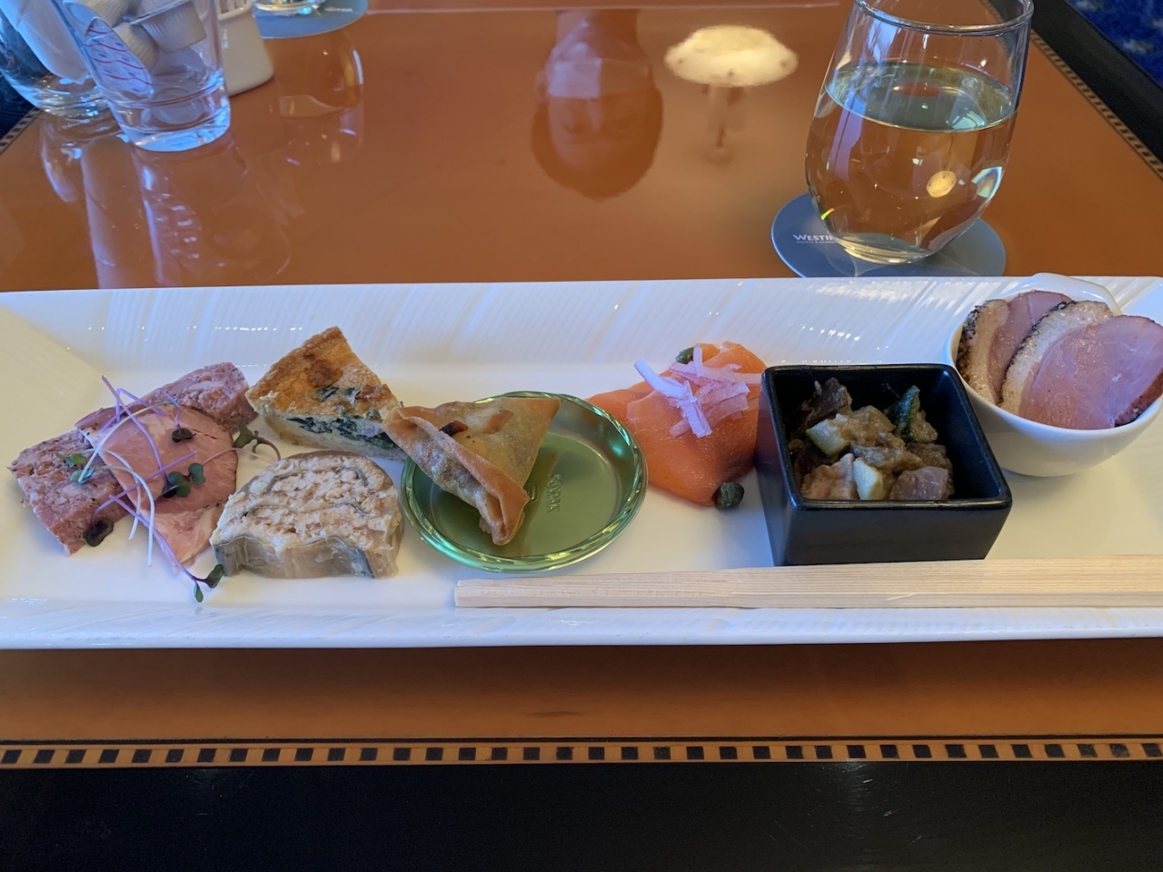この時はどちらの時間帯もブッフェ方式ではなくプレートで提供されるシステムで、ティータイムのラインナップはやや微妙でしたが、カクテルタイムのプレートはちょうど良い量で比較的満足できるのではないかと思います。