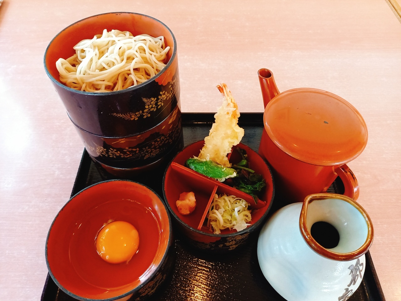 迫町(佐沼)と中田町との境付近にあります。県道築館登米線からちょっと入った所で、近くにはコメリがあります。かけそば506円からあります。そば、天婦羅、海鮮類がメインです。今回は、屋敷そば979円をいただきました。小鉢のそば三段に天婦羅、生卵、山菜等が付いてきます。器はいっぱいあるのですが、麺つゆを生卵の器に入れると一気に薄くなるし、どれに麺つゆを入れれば良いか迷いました。