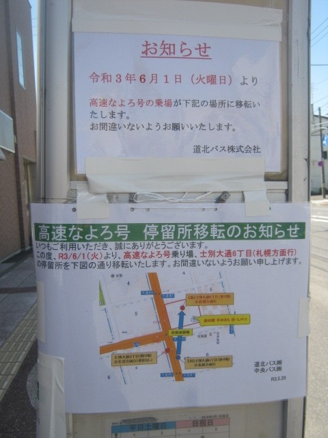 高速なよろ号・士別市内の停留所の場所が変更になりました