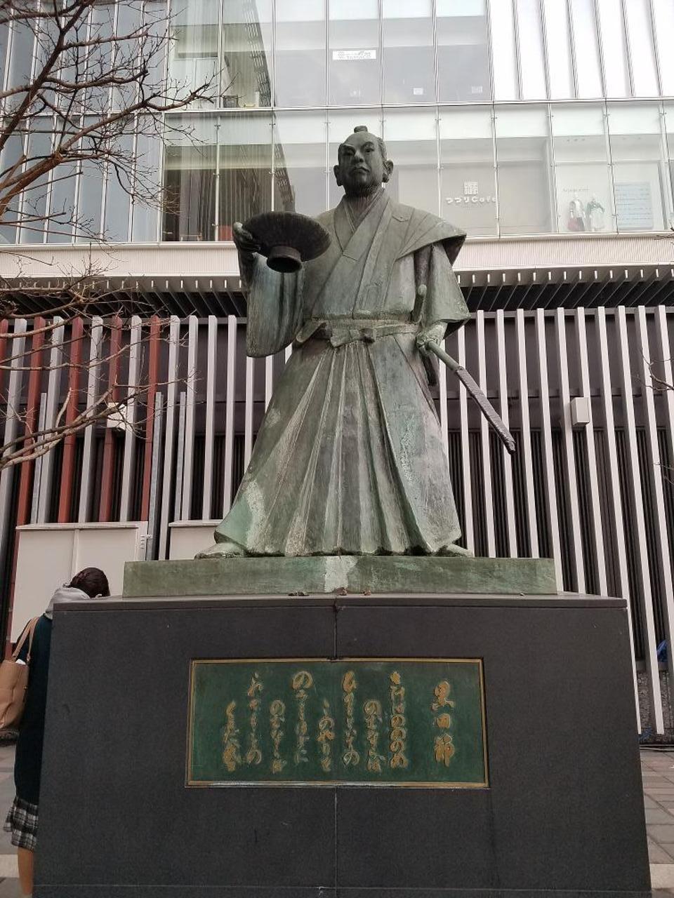 博多駅の博多口は広いイベントスペースがあり、一角に黒田節の銅像があります。「酒は呑め呑め」で有名な黒田節を讃える立派な銅像ですが、道行く人々は気に止めることもなく通り過ぎていました。人物そのものが偉人ではないので、地元の方々は思い入れはあまりないかもしれません。