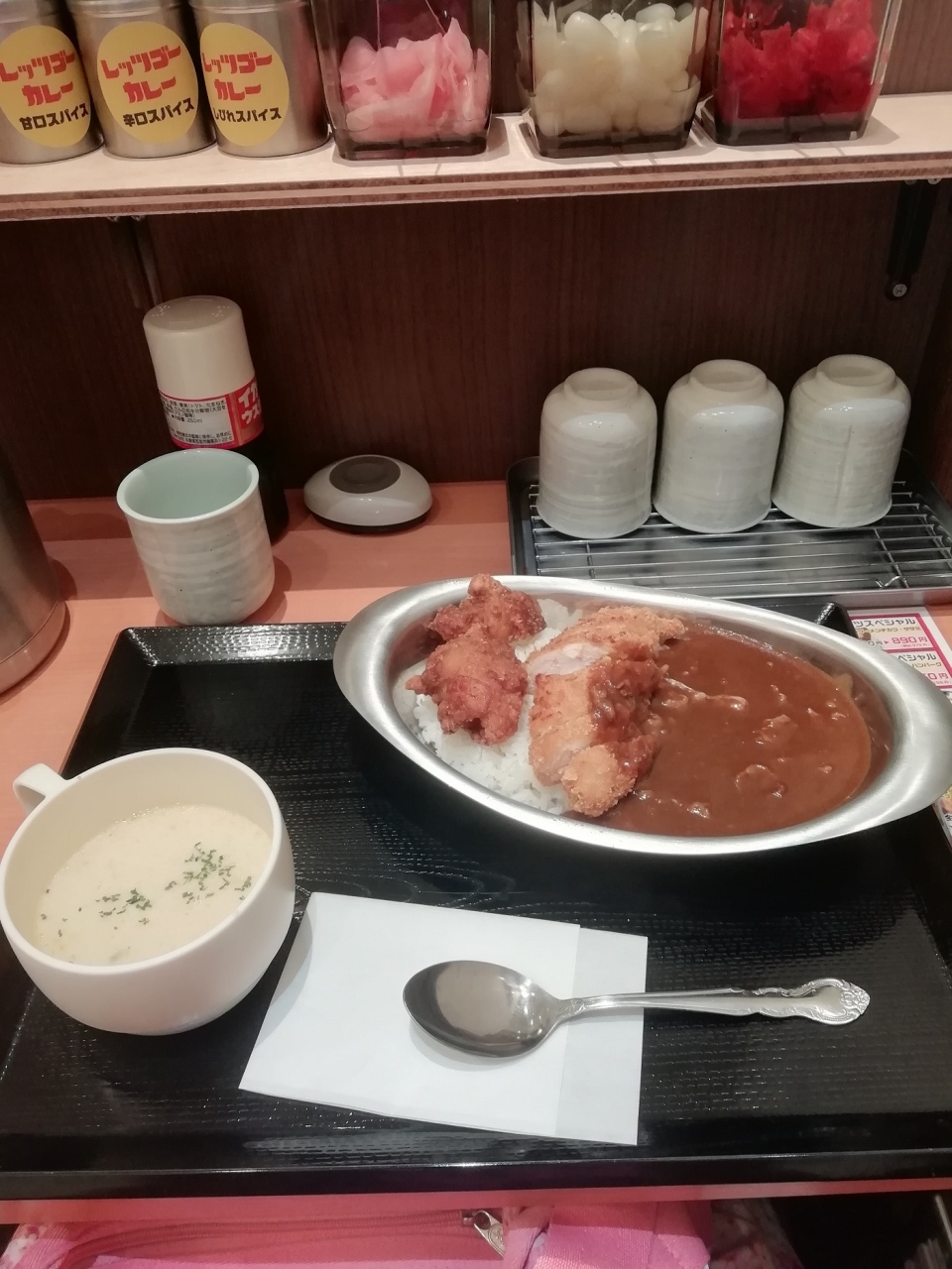※8/2追記 先月頃より、一部メニューが変わりました。野菜トッピング(ナスやホウレン草など)が加わり、クラムチャウダーはメニューから消えていました。また、ライス少な目も選べます。