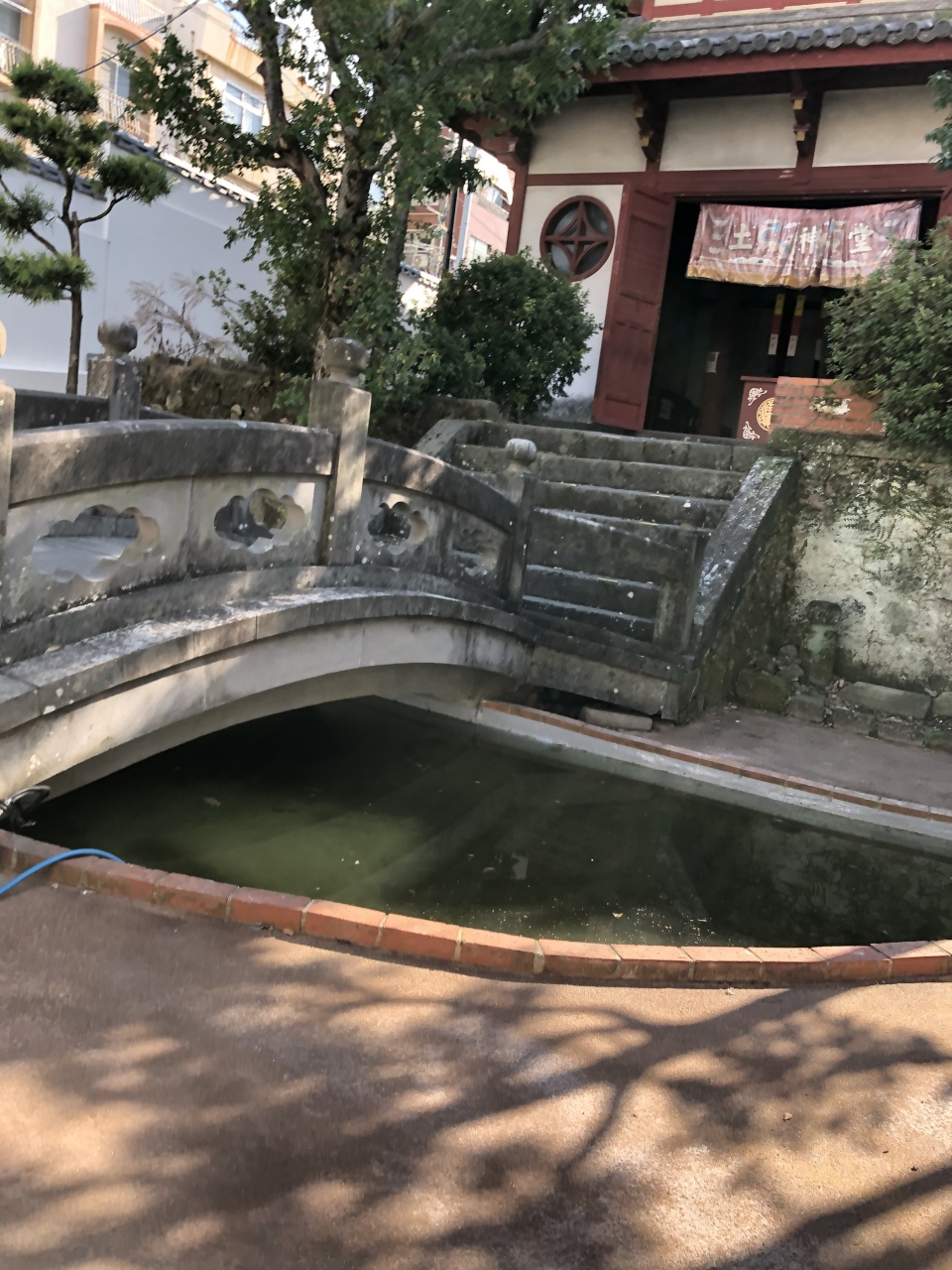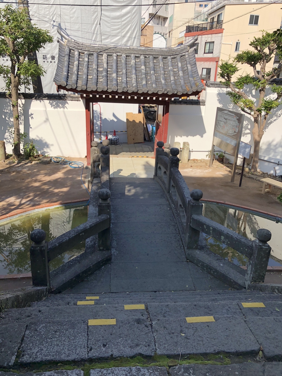 湊公園から唐人屋敷象徴門をくぐって歩いて行くと、一番最初に突き当たるのがこの土神堂でした。それほど大きな境内ではありませんが、小さいながらも池があり太鼓橋もかかっていて、その景色がとてもよかったです。