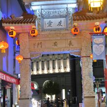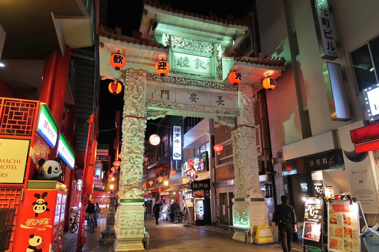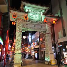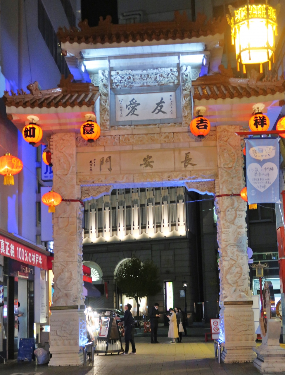 入口に布袋さんの像があり、福を呼ぶ縁起のよい門、白大理石が美しく、竜宮城を思わせる。高さ9.85m、幅7.4mで、中国が海外へ輸出を許可した第1号の漢白玉楼門。南京町ランターンフェアだったので、中国の提灯が吊るされ、夜の幻想的な雰囲気を演出していました。