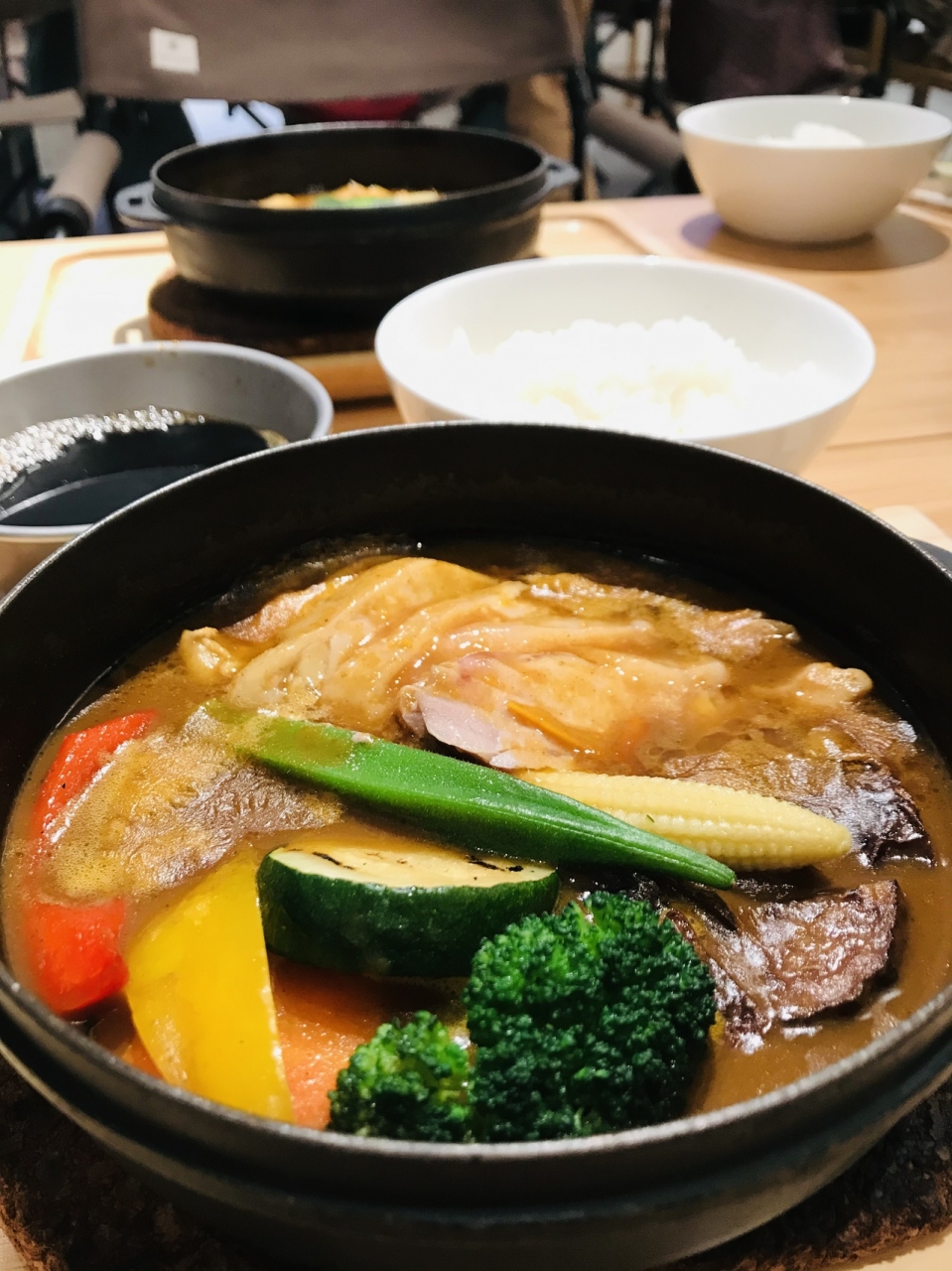 和風スープカレーで、スチームしたチキンといろどりの野菜が、スノーピーク製品のスキレットに入って提供されます。