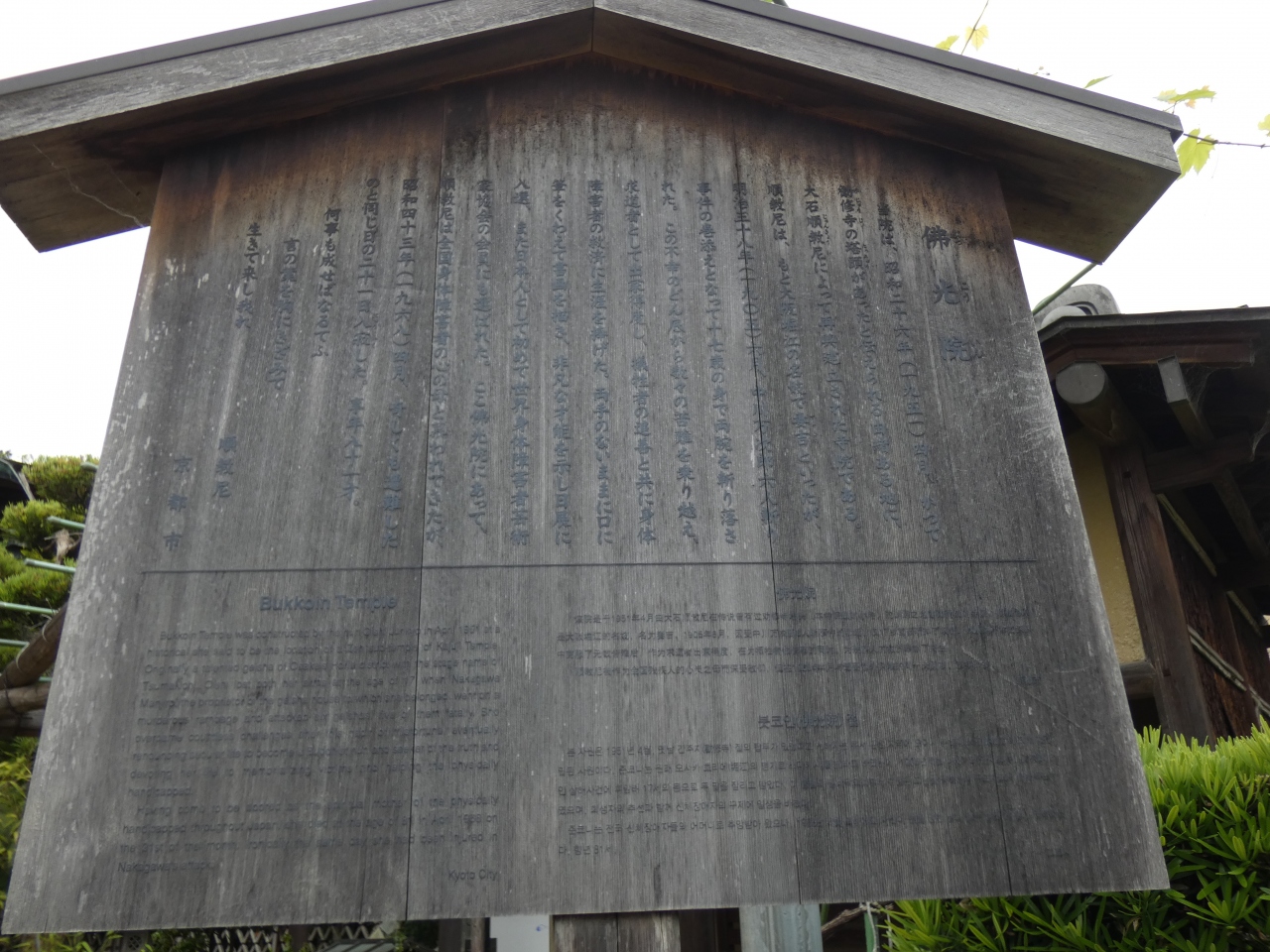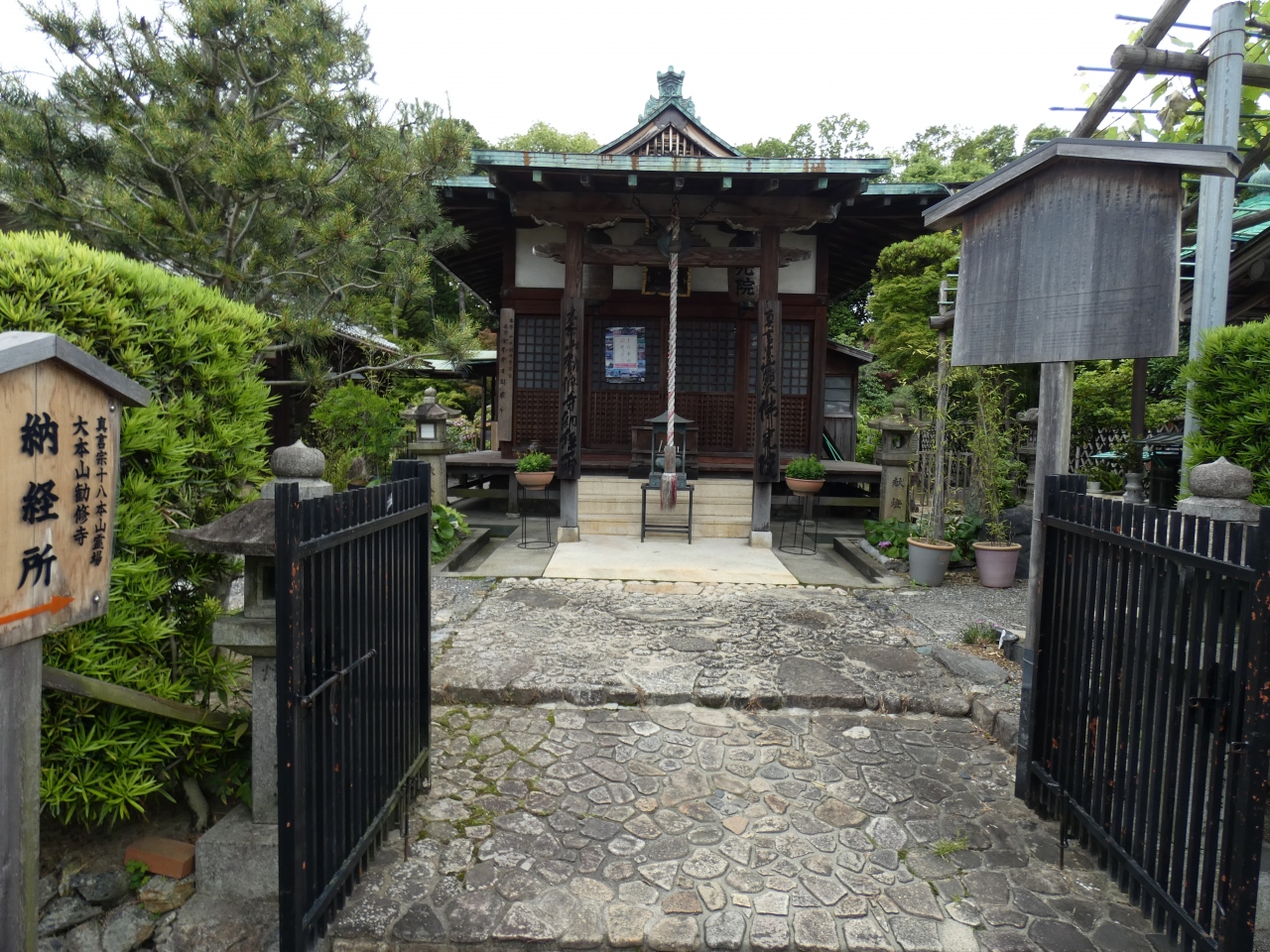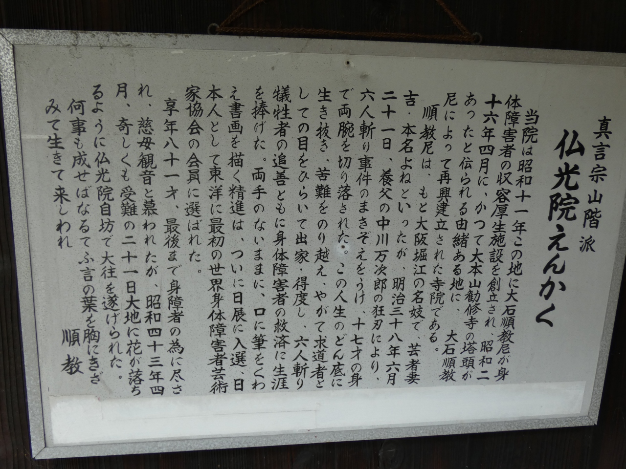 京都市山科区の名刹・勸修寺の南に隣接して建つ真言宗山階派寺院。昭和26年かつて勸修寺塔頭があったとされる地に大石順教尼によって再興建立された寺院です。明治36年に6人切り事件の巻き添えで両腕を切落され、その後出家得度して身体障害者の救済に生涯をささげた口筆の画家・順教尼ゆかりの寺です。勸修寺境内にも所縁の可笑庵があります。