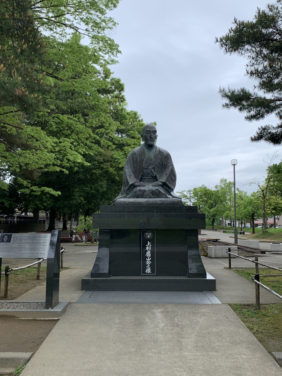 上杉鷹山公之像は松が岬公園内にありました。上杉鷹山は上杉重定の養子になり、9代目米沢藩主になります。大検約令を発したほか、農政を改革しました。教育を進め産業を発展させたと伝えられています。公園付近には全部で3つの上杉鷹山像があるそうです。