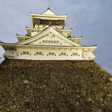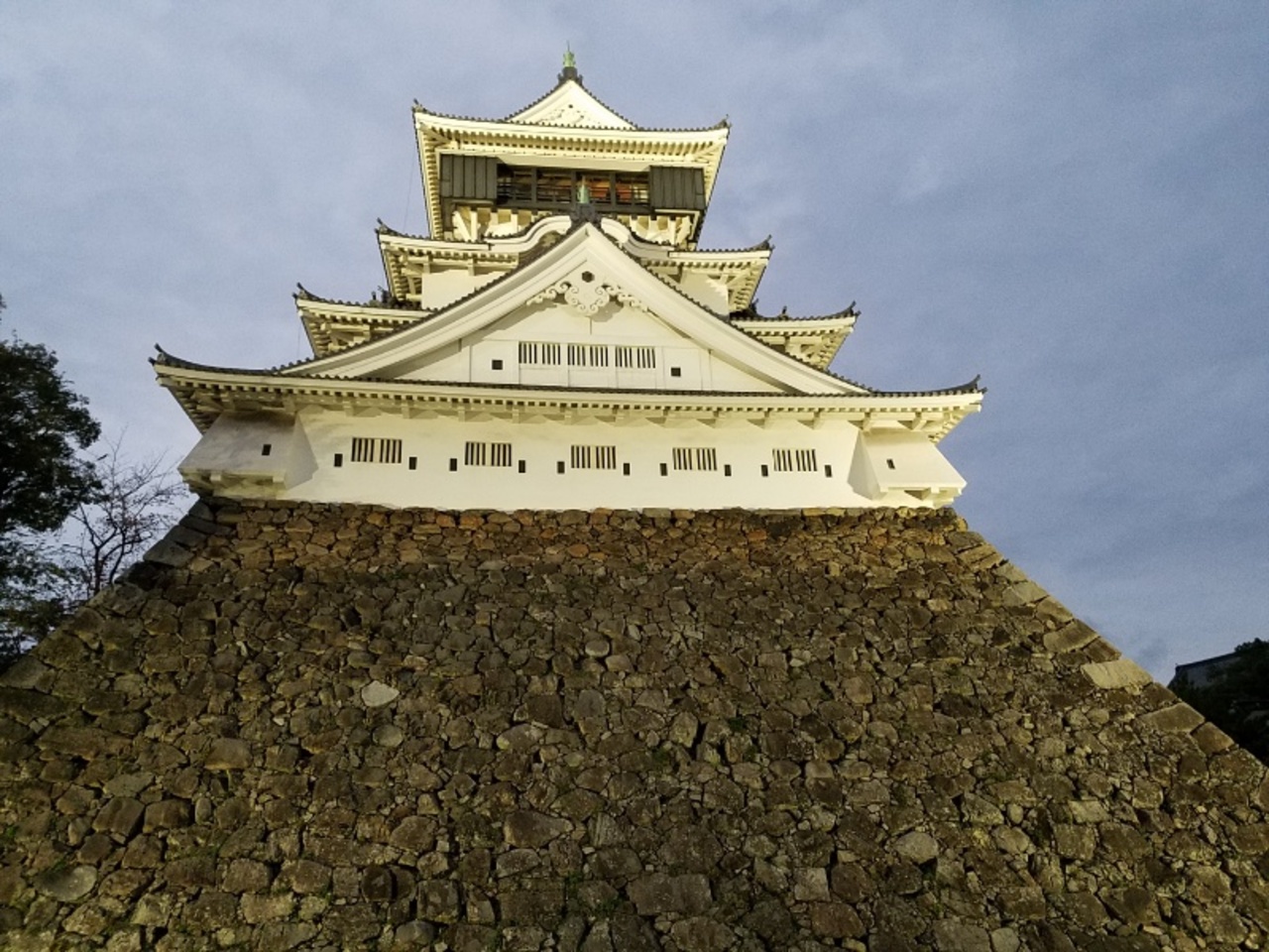 紫川を鴎外橋で渡って着きました。大きな台形の形の石垣に天守が乗っているシルエットが美しいです。大きな石垣だけならば大阪城などでも見られましたが天守も乗っているとやはり本来の城の姿が分かりやすいですね。天然の掘になっている紫川が注ぐ響灘に睨みをきかせる海城であることも地理上分かりやすくて色々と勉強になりました。