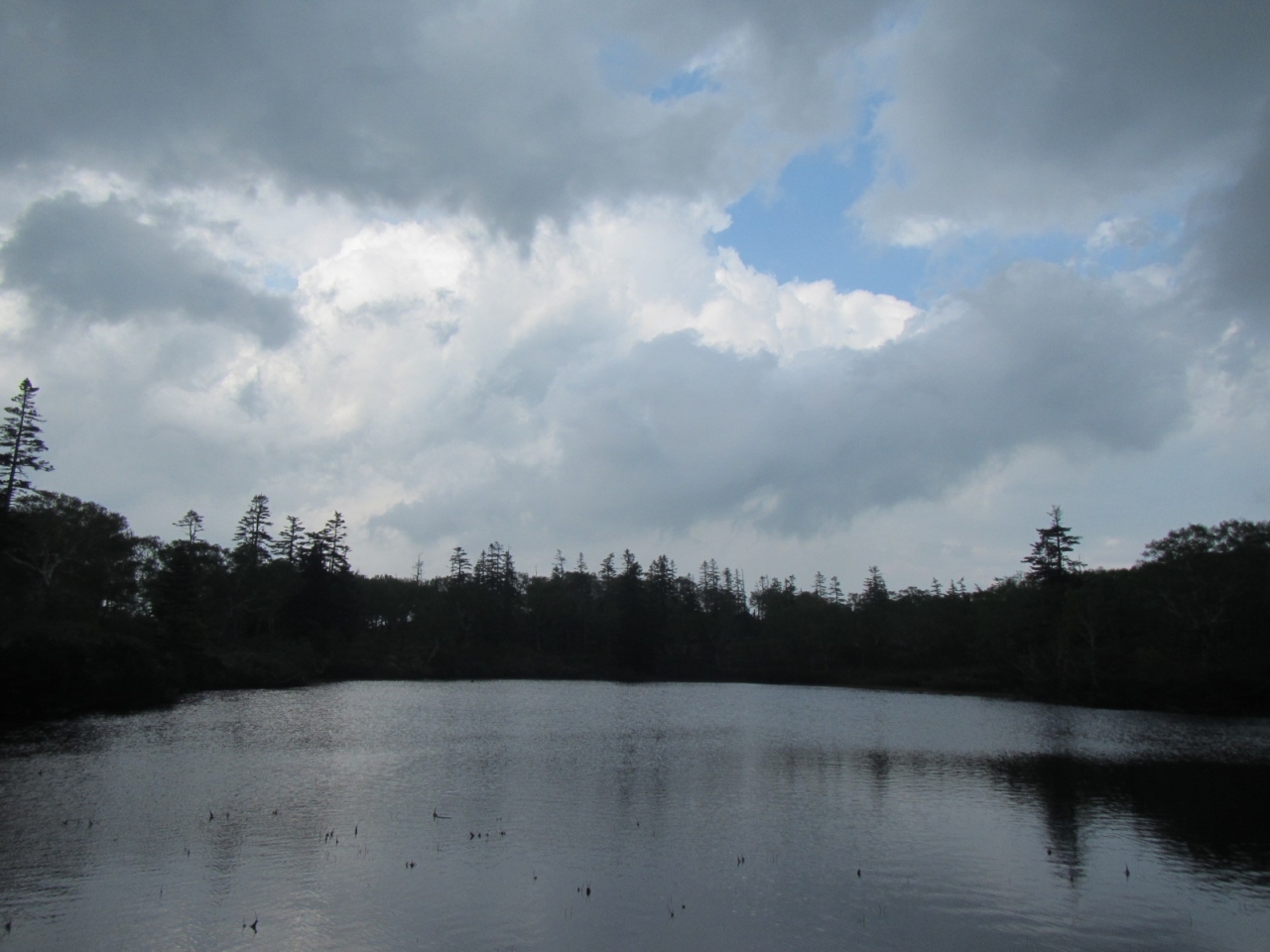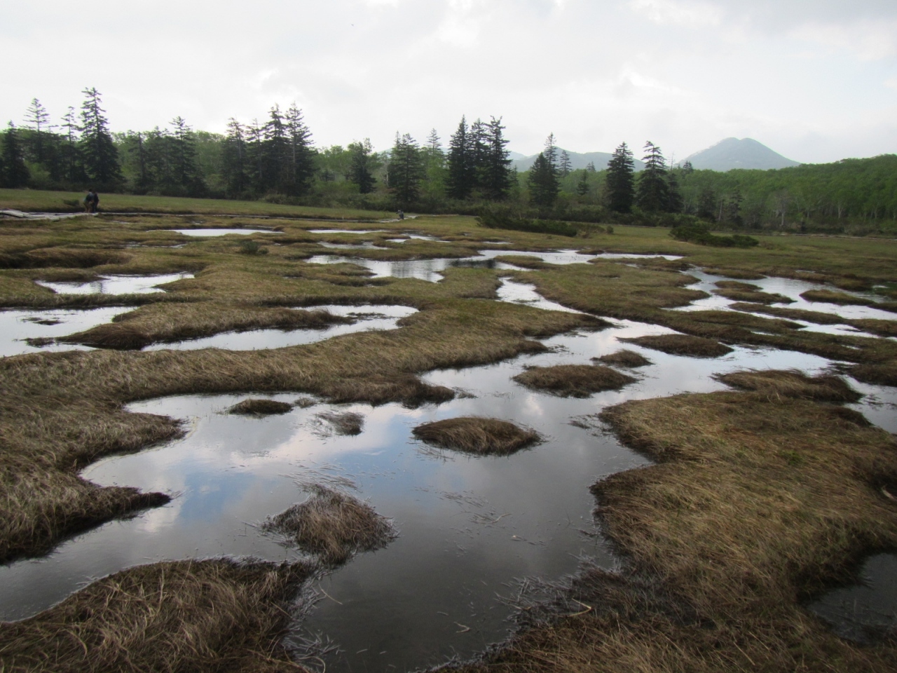 6月上旬、沼や湿原、アクセスする木道上の雪は無くなっていましたが、湿原上は枯草で覆われ、木道には周囲の灌木やクマザサが雪の重みで倒れこんだものが戻りきっていないものもあって、湿原に至るまでの道のりはやや歩きにくい感じでした。