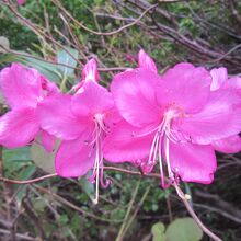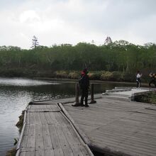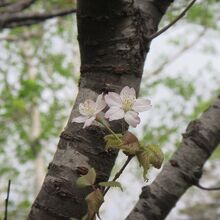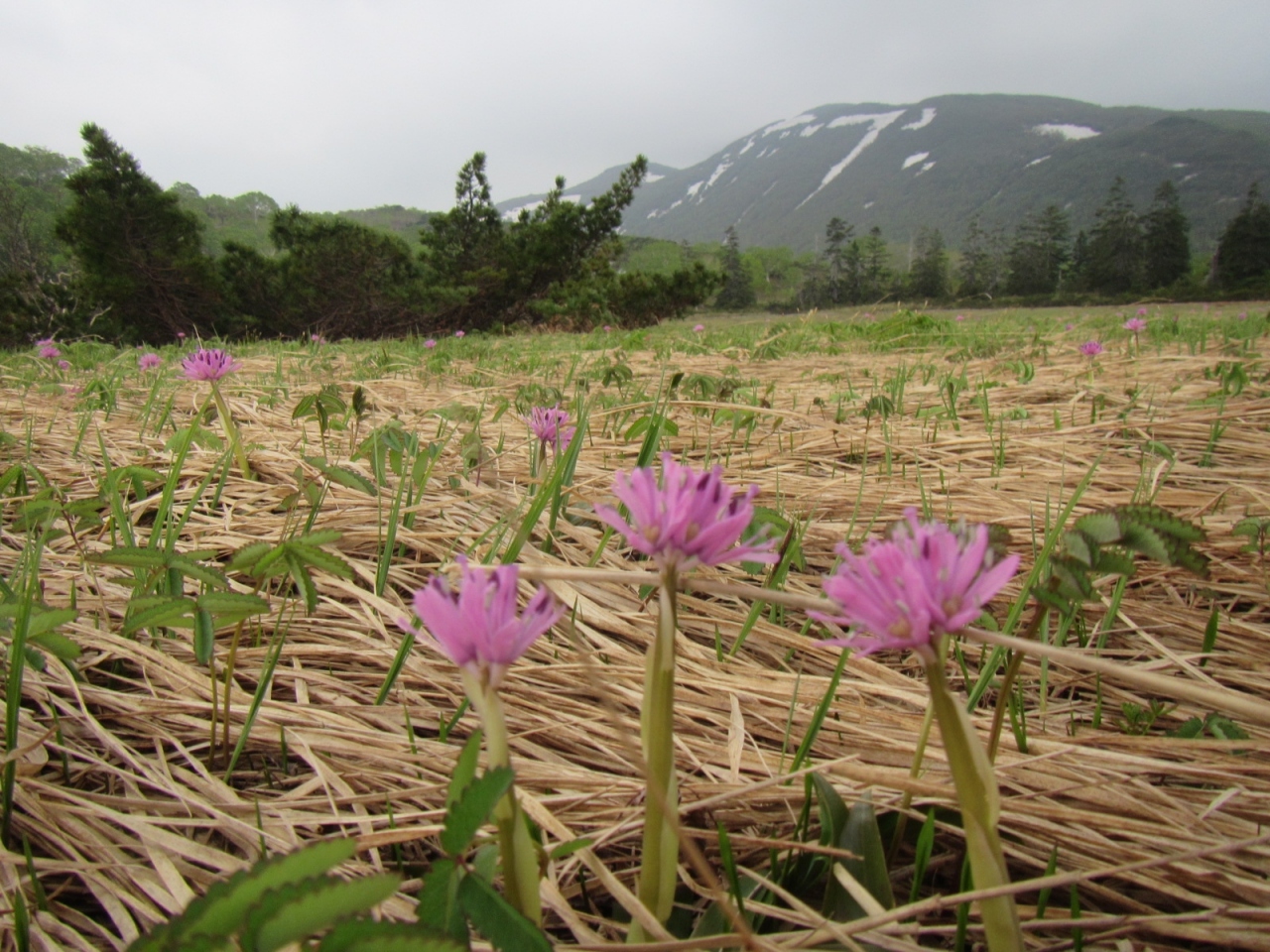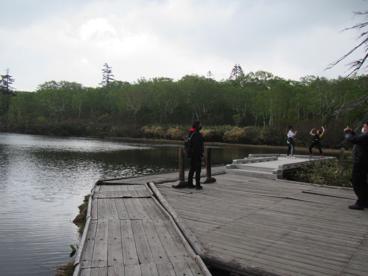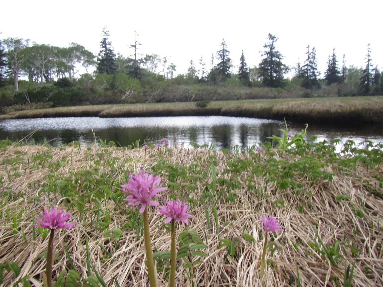 湿原に至る木道沿いには、クマザサの影にミズバショウがちょこちょこと咲いていたほか、ザゼンソウが咲いているところを1カ所、見つけることができ、ムラサキヤシオツツジやチシマザクラも見られました。