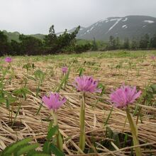 また、湿原に出ると、端っこにミズバショウが咲いていたほか、こちらもちょこちょこと枯草の中にショウジョウバカマのピンクの花がかわいらしい感じで咲いていました。