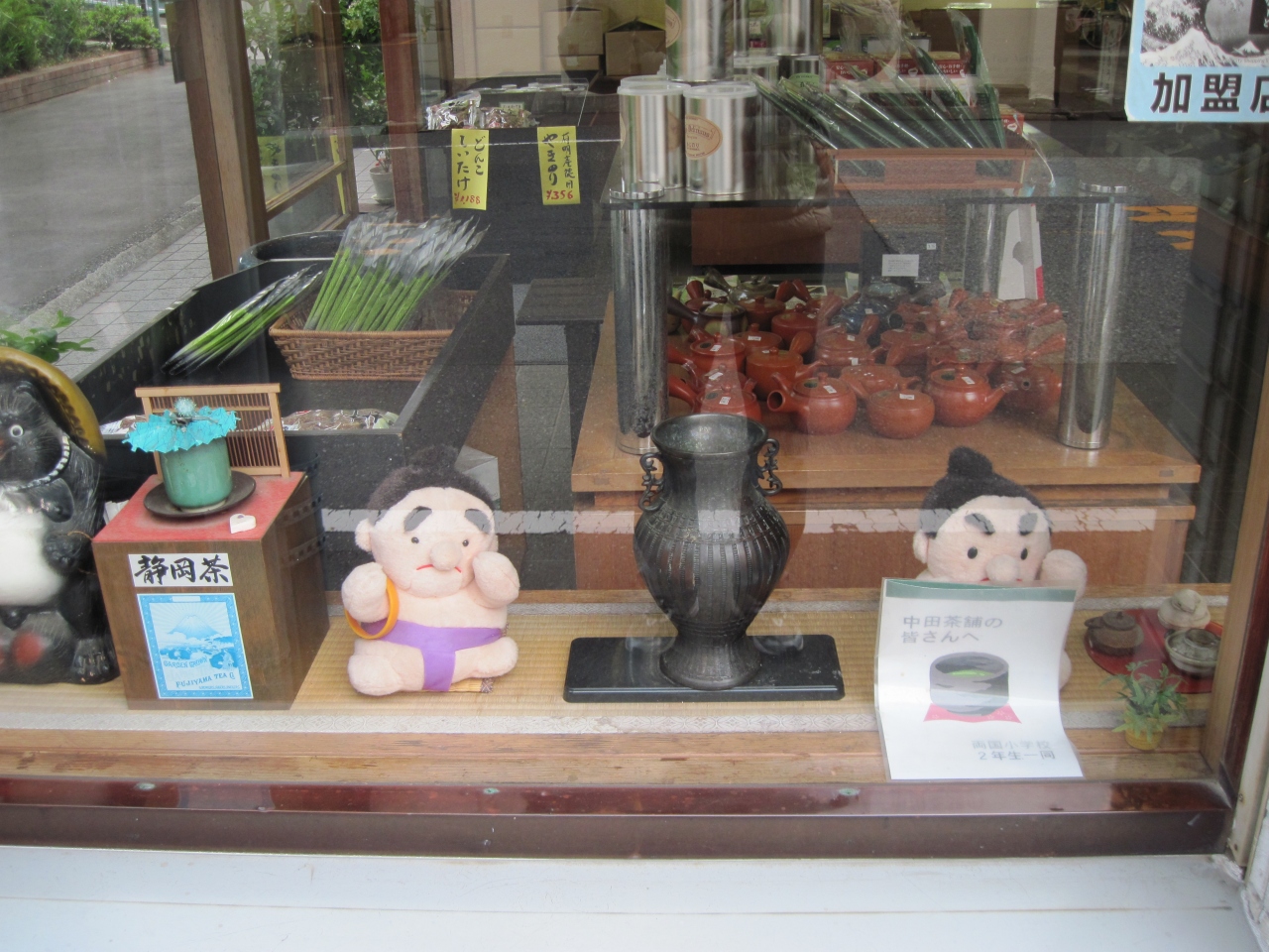 森下周辺を散策していて、お茶屋さんの店先に立札が建っていました。かなり歴史のあるお茶屋さんで、看板も風格が漂っていました。場所は堅川の二之橋のすぐ脇にあります。s両国にも近いので、小学生が贈ったのでしょうか、お相撲さんの人形がショーウンドウに飾ってあって可愛かったです。