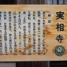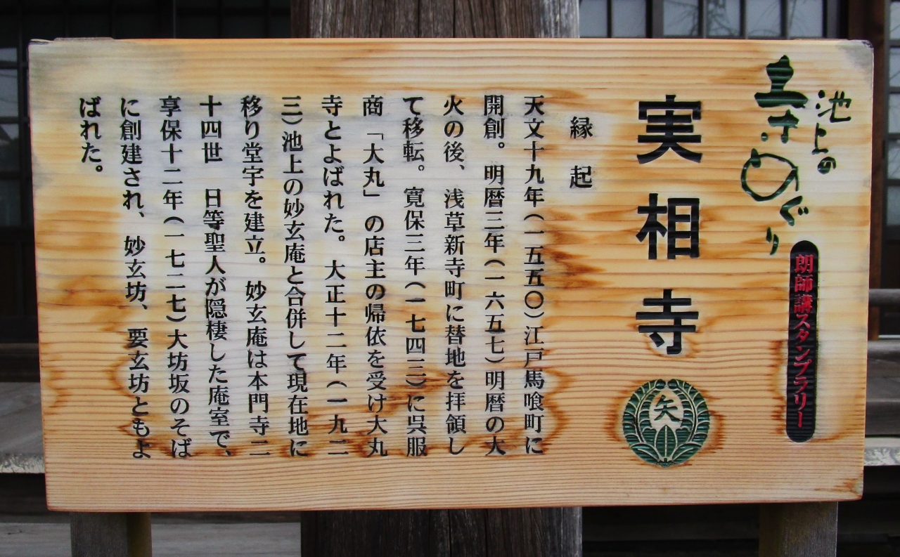 實相寺は、天文19年(1550年)に江戸馬喰町に開創、明暦3年(1657年)明暦の大火の後、浅草新寺町に替地を拝領して移転、大正12年(1923年)池上の妙玄庵と合併して、現在地に移り堂宇を建立しました。