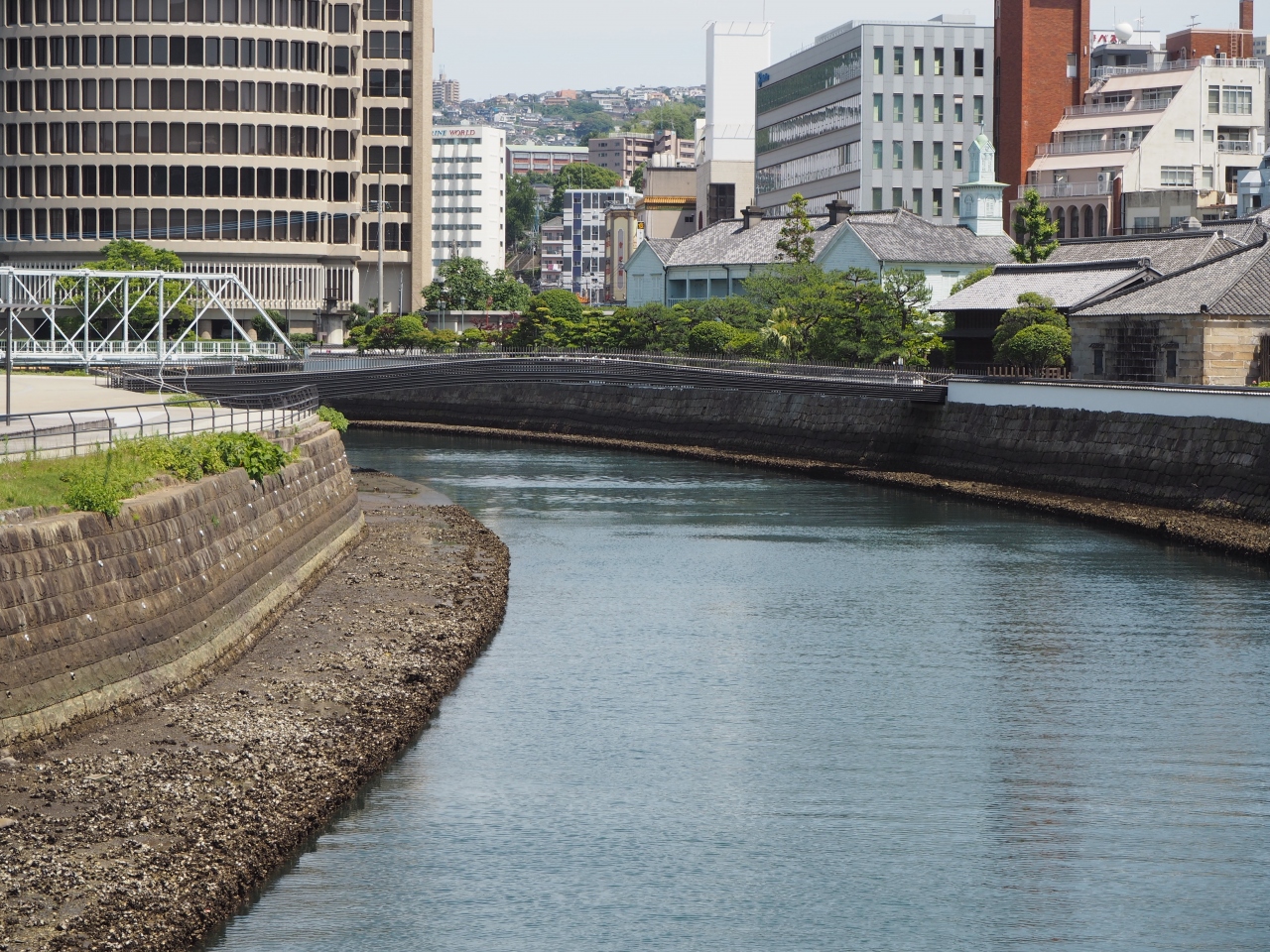 銅座川は新地中華街の北側を流れる川です。下流の途中で中島川と合流して長崎湾に注ぎます。海に近い川なので川の流れはあまり感じられません。水はどんよりした感じもあります。新地中華街から上流は暗渠になっていて川の景観は見られません。