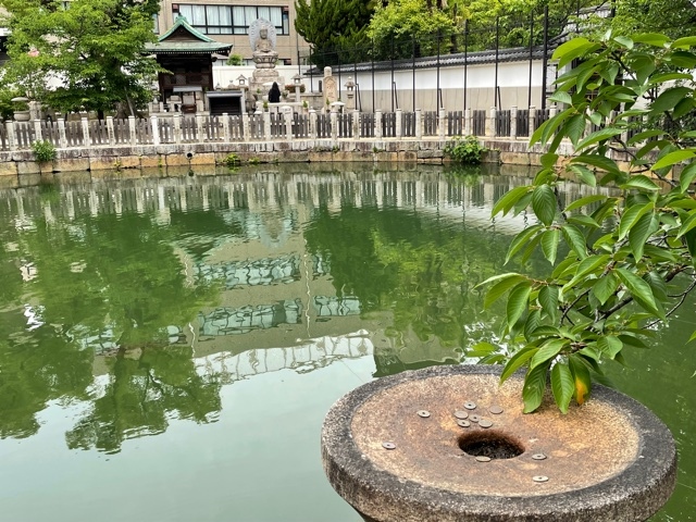 四天王寺境内には、幾つかの池が見られますが、仏足石の前にある丸い形をした池が丸池です。この池の水は、涸れることがないとの伝説から、雨乞いを行う時には、この池の聖水を使って祈祷をしていたのだそうです。池の周りには桜が植えられ、満開の時期はとてもきれいだそうです。