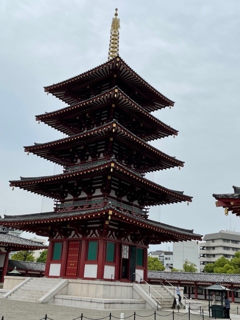 四天王寺の五重塔は回廊に囲まれた中心伽藍の南側に立っており、五重塔の後ろに見えるのが金堂です。五重塔は聖徳太子が創建時に六道(地獄・餓鬼・畜生・修羅・人間・天上)利救の悲願を込めて、塔の礎石心柱の中に仏舎利六粒と自らの髻髪(きっぱつ)六毛を納めたので、別名「六道利救の塔」ともいわれています。