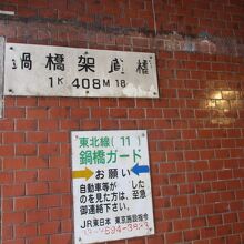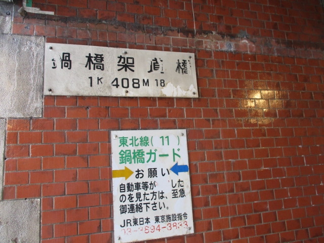 JR神田駅北口改札から中央通りの交差点を渡ると神田平成通り上にある鍋橋架道橋に歩いて直ぐ着きます。鍋橋架道橋は中央線が開通した大正8年(1919年)で関東大震災や東京大空襲にも耐えた赤レンガは古びていました。レンガ造りの外観は歴史を感じさせてくれる雰囲気があります。残念ながら架道橋の歩道は一部駐輪場なっていて架道柱が剥き出しになっていました。昼でも少し薄暗く自動車の往来も激しいので注意しましょう。