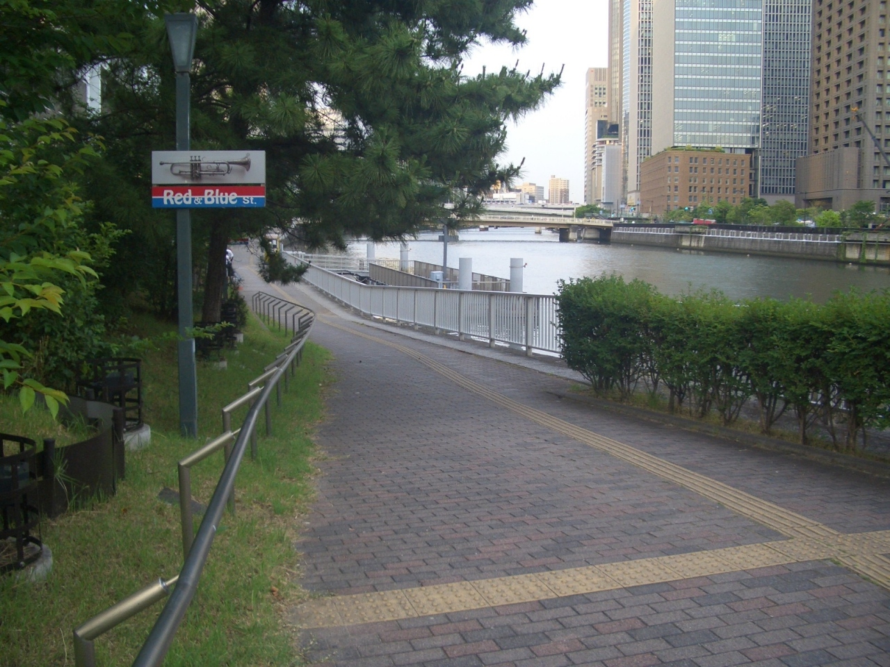 京阪中之島駅の近く、堂島川沿いにある遊歩道です。正式名は福島浜緑道というそうです。トランペットとRed&Blue Streetと記載されたオシャレな看板が数個ありました。川沿いを散歩するにはgoodなスポットです。夜景もgoodです。
