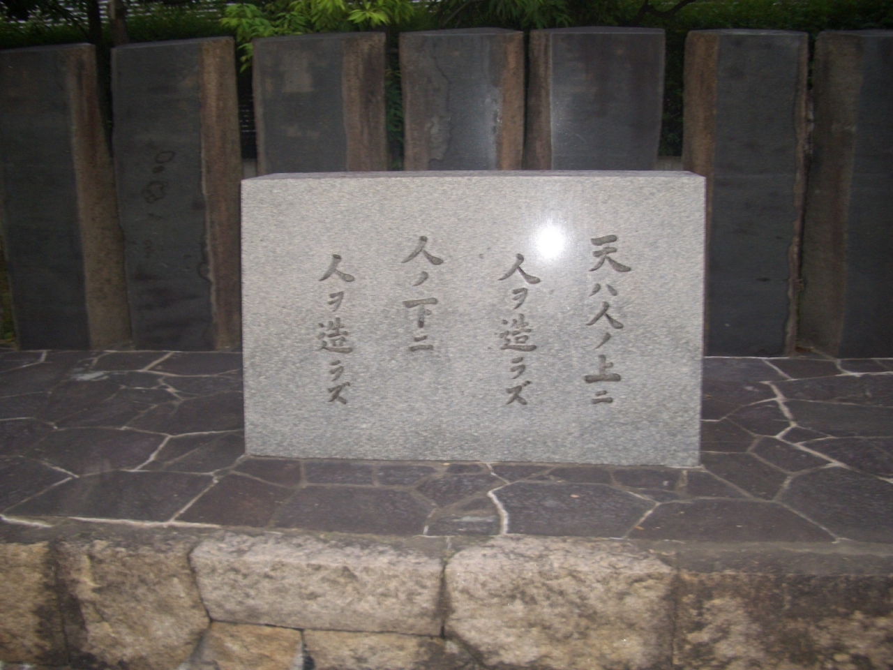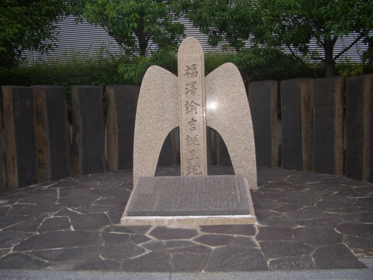 福沢諭吉誕生地記念碑は、玉江橋北詰にあります。ユニークな形の記念碑です。近くには、有名な「天は人の上に人を造らず、人の下に人を造らず」の石碑もあります。福沢諭吉は、1834年、この地にあった中津藩蔵屋敷で生まれたことから中津藩蔵屋敷舗之跡の石碑もあります。福沢諭吉は、明治の文明開化の思想家として活躍し、慶応義塾を開設し人物です。