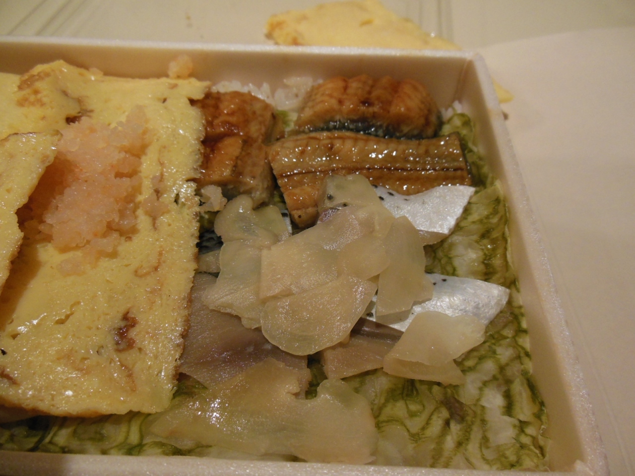 玉子焼きが敷き詰められていますが、その下には、うなぎやえび、こはだが入っています。