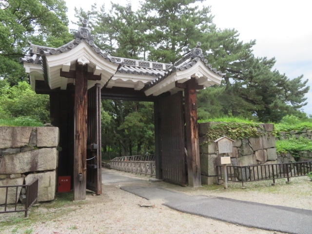 本来は、東鉄門という二之丸東の桝形外門で、現在の東門の東側にありました。昭和38年に愛知体育館が建設される時に解体されて、この場所に移築されました。両側の柱の上に小さな屋根が乗っていて、その上にもう一つ屋根が乗っているユニークな構造です。