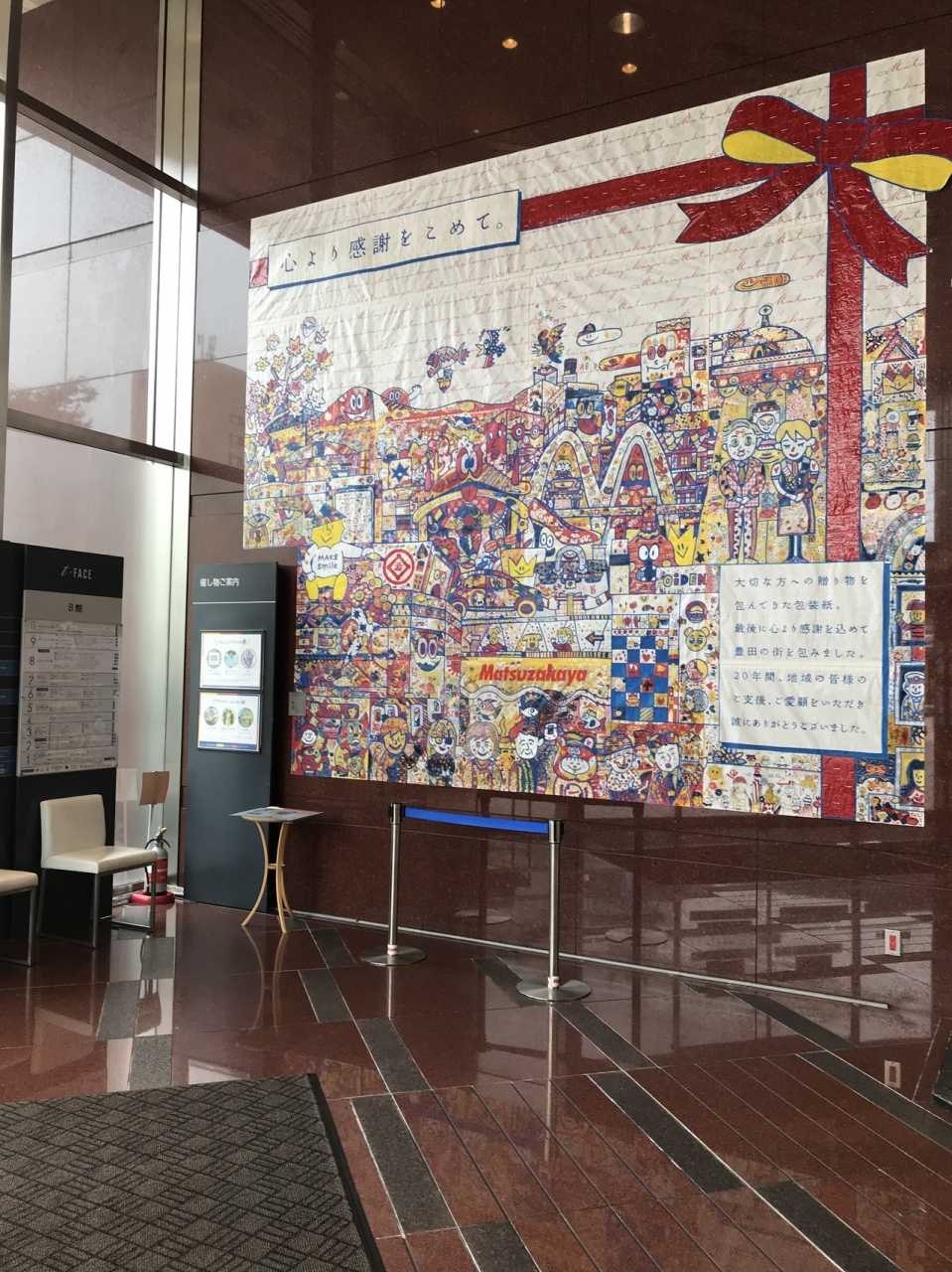 愛知県三河地方唯一になってしまった百貨店ではあるが、東京や大阪の郊外百貨店に比べると店内の客は少なめ(コロナ禍の影響もあるが)。そのせいなのか、2021年9月に閉店。閉店を記念して近隣の子供達が描いた壁画が貼ってあった。