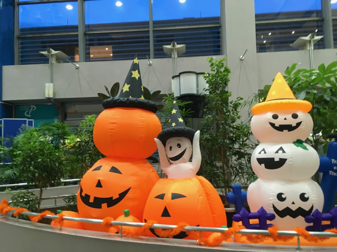 翌月にある本番を前に、アトリウムにハロウィンの飾り付けがされていました。