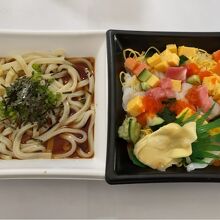 バラちらしセット(そば、うどん、サラダから1つ選べる)907円(税込)を注文。大盛りも無料です。取りに行ったら10%オフという大サービス。