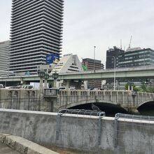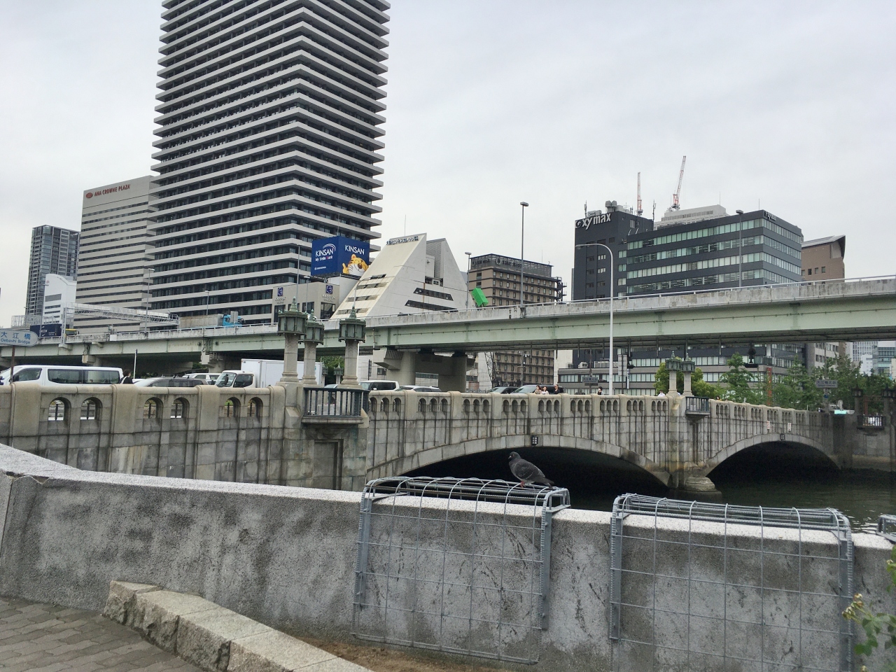 御堂筋の堂島川に架かる橋で、南側が淀屋橋、北側が大江橋になります。橋を渡ると大阪市役所や日銀大阪支店があります。古くは江戸時代の元禄年間、堂島の開発に伴って架けられた堂島川五橋(大江橋、渡辺橋、田蓑橋、堀江橋、船津橋)のうちの1つです。現在の橋は1935年に完成したもので、一部補修された以外は当時のままの姿を留めています。国の重要文化財に指定され、浪速の名橋50選にも選定されています。