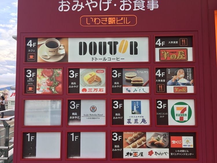いわき駅は駅ビルが併設されているような大きさの駅に見えませんでしたが、3・4階に店舗スペースがありました。コンビニのほかはカフェ、食堂、おみやげ屋さんで数は少ないですが、品質が読めるチェーン店はかえって利用しやすいと感じました。
